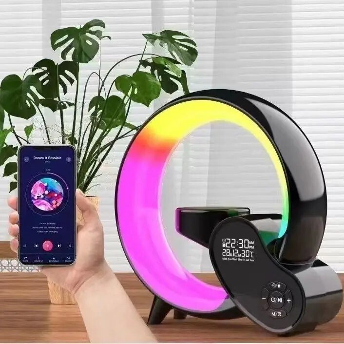 Большая настольная лампа ночник 4 в 1 с Bluetooth колонкой, будильником и беспроводной зарядкой