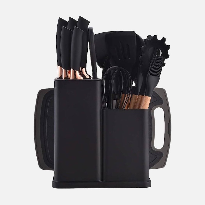 Набор кухонных принадлежностей на 19 предметов: силиконовые приборы + набор ножей + доска для нарезки
