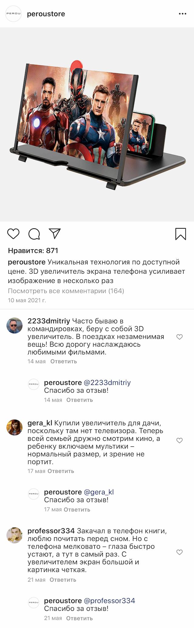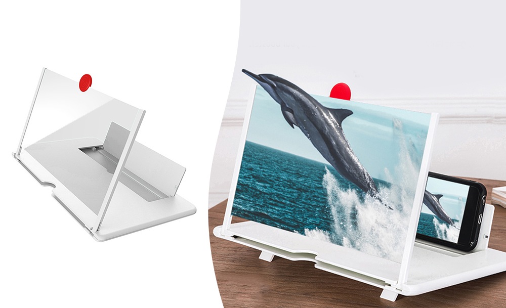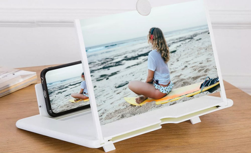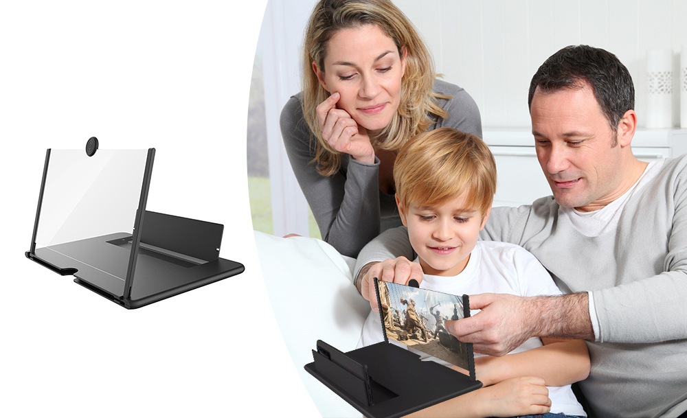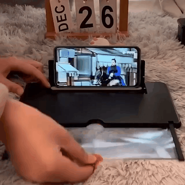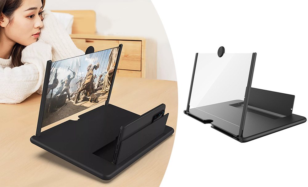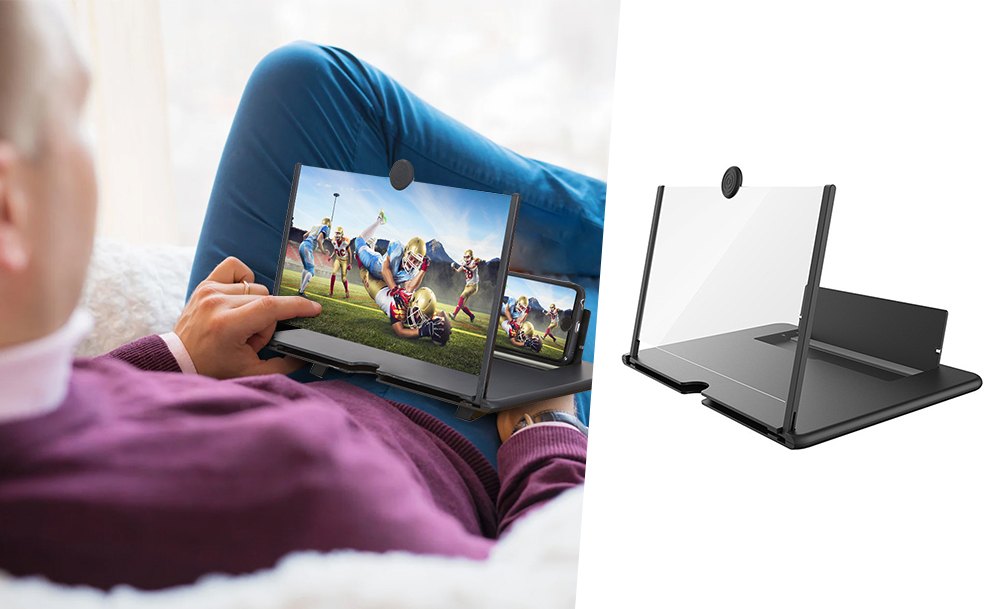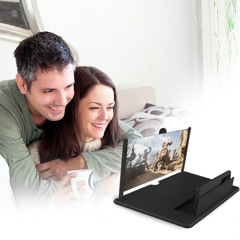 3D увеличитель экрана телефона усиливает изображение в 5 раз. При длительном просмотре видео и сайтов или чтении со смартфона значительно снижается утомляемость глаз. Увеличенный экран 12 дюймов позволяет располагать его на оптимальном для зрения расстоянии 2 – 3 метра. Специальное стекло-фильтр защищает глаза от вредного излучения. Картинка остается яркой и четкой, не теряет качества, наоборот, становится более реалистичной.