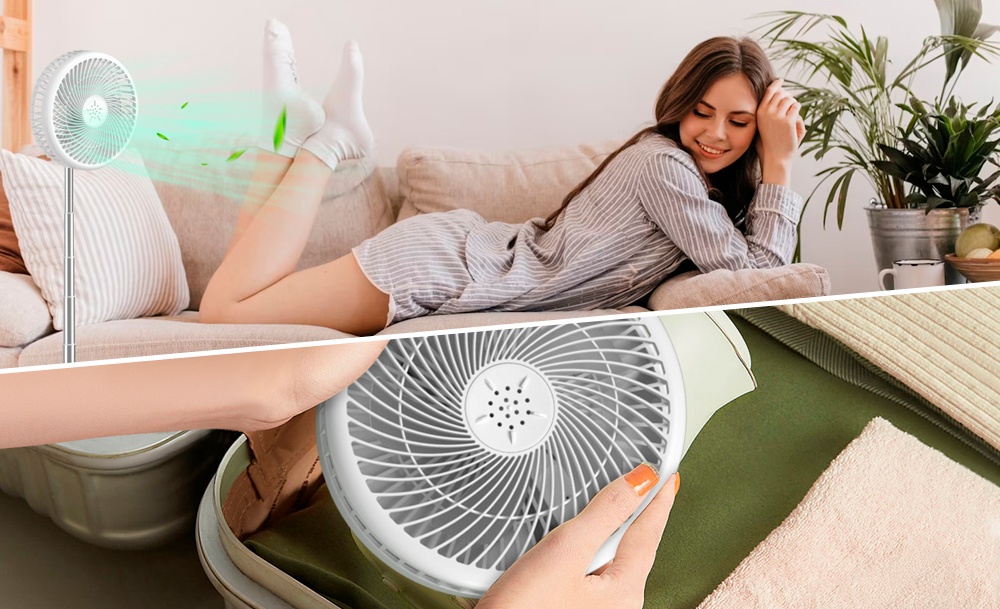 С помощью переключателя возможно выбрать 3 режима работы. Телескопическая опора позволяет поднять рабочую часть вентилятора на высоту до 1 метра, а шарнирная конструкция обеспечивает различные углы и положения вентилятора. В сложенном состоянии вентилятор не занимает много места его можно брать с собой в путешествие и легко хранить.