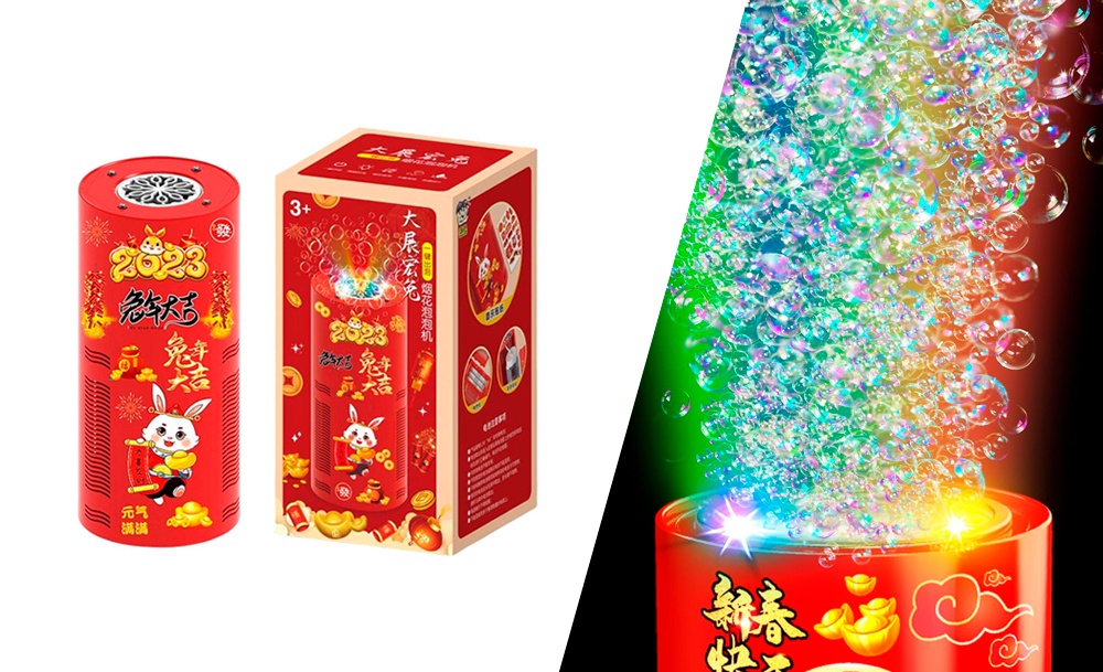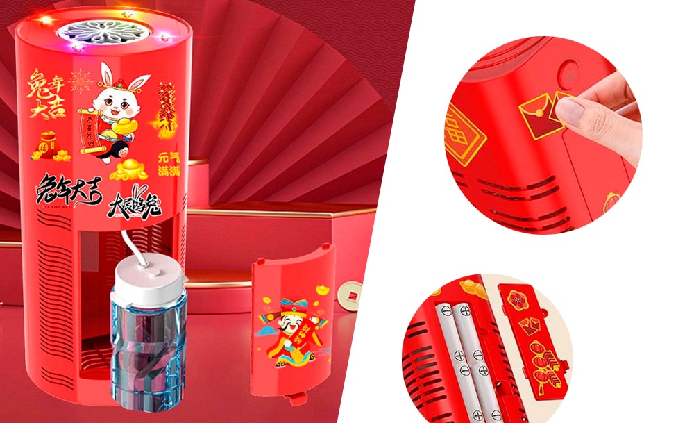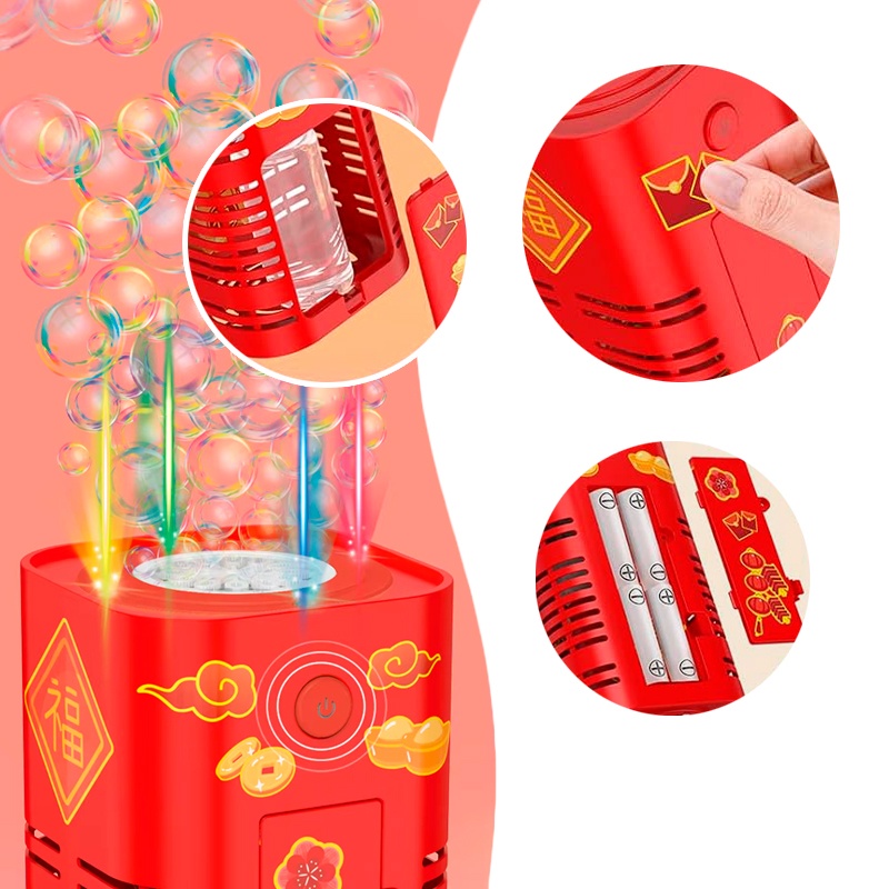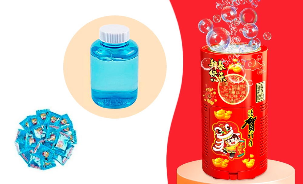 Данное устройство оснащено механизмом, который с помощью специального раствора и встроенного вентилятора создает густой поток мыльных пузырей. Верхняя часть конструкции имеет множество отверстий, из которых создаются пузырьки, а сбоку корпуса генератор мыльных пузырей фейерверк имеет специальный отсек для емкости с жидкостью.