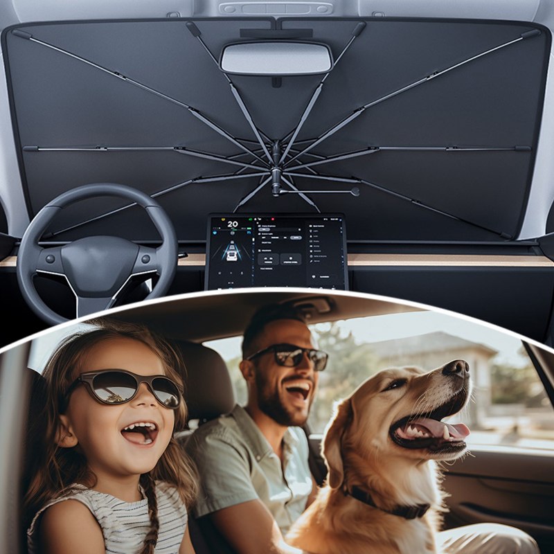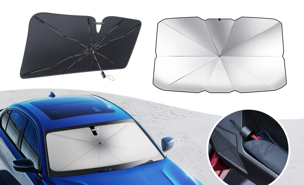 В комплекте — зонт-шторка на лобовое стекло, которая защищает от солнечных лучей и предотвращает перегрев салона. Простая установка — всего за несколько секунд. Это идеальное решение для комфортных поездок в тёплое время года!