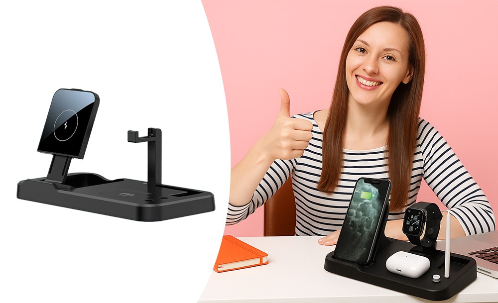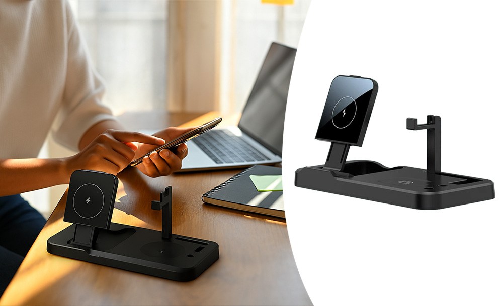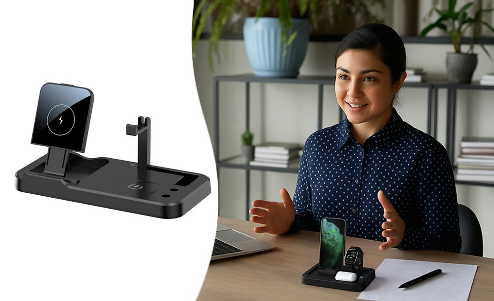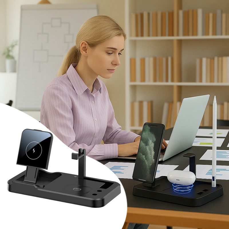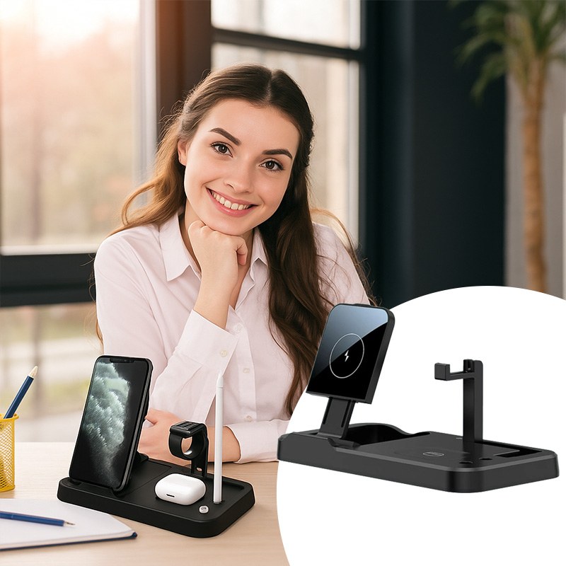 Встречайте беспроводную зарядную док-станцию 4 в 1 HS-299 – идеальное решение для современного ритма жизни. Она одновременно заряжает смартфон, часы, наушники и даже имеет отдельное место для стилуса. Забудьте про путаницу с кабелями – все компактно, удобно и всегда под рукой.