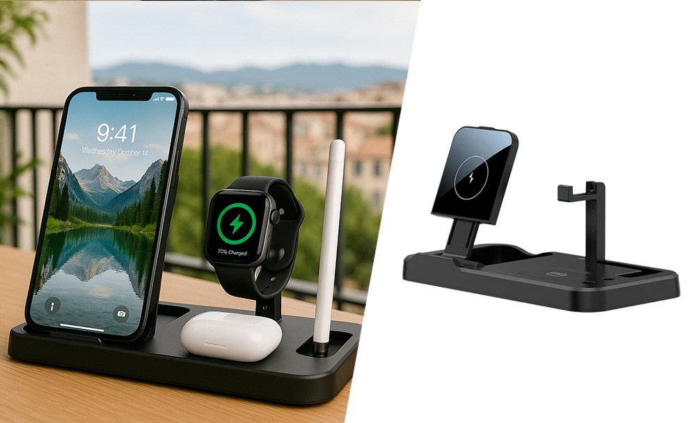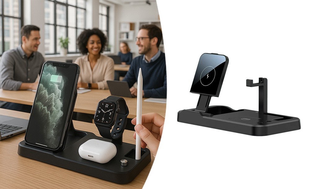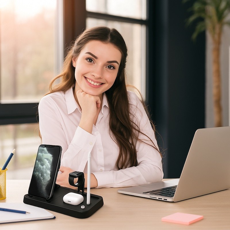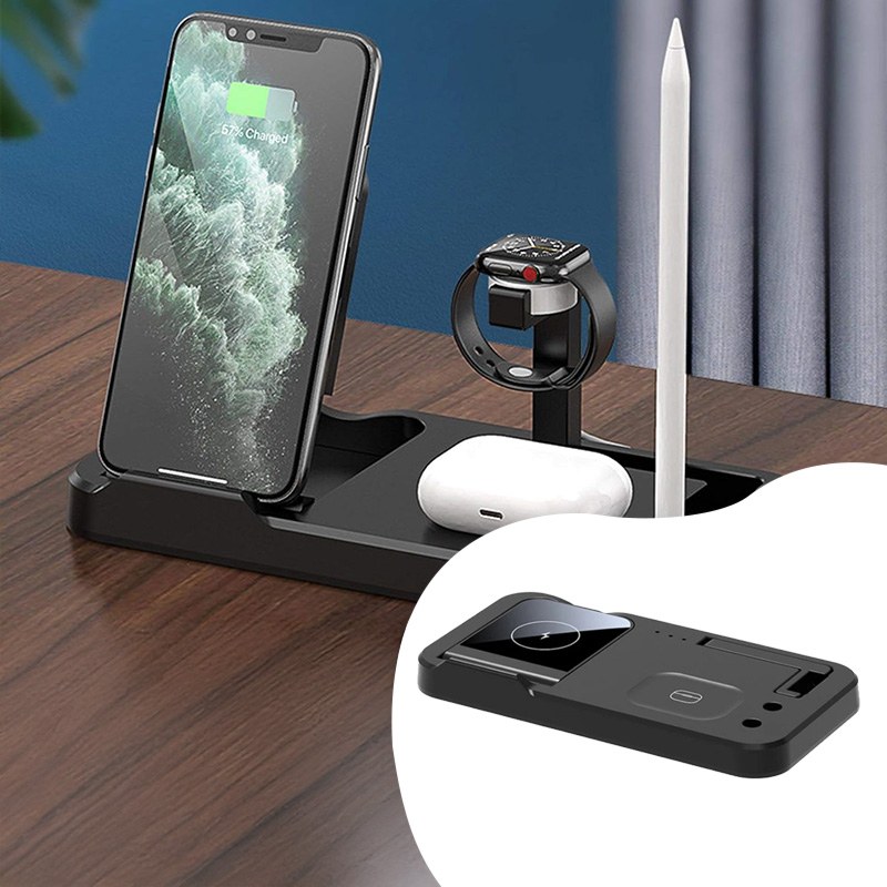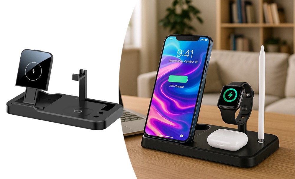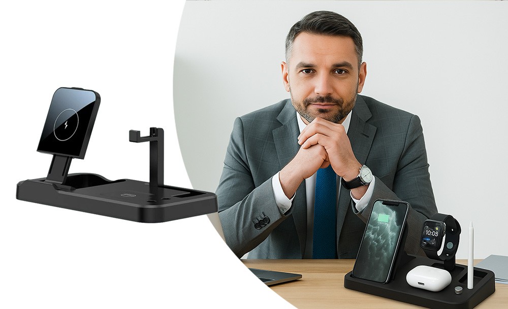 Встречайте беспроводную зарядную док-станцию 4 в 1 HS-299 – идеальное решение для современного ритма жизни. Она одновременно заряжает смартфон, часы, наушники и даже имеет отдельное место для стилуса. Забудьте про путаницу с кабелями – все компактно, удобно и всегда под рукой.
