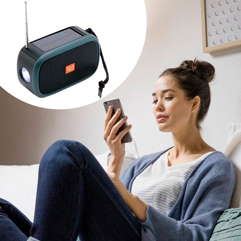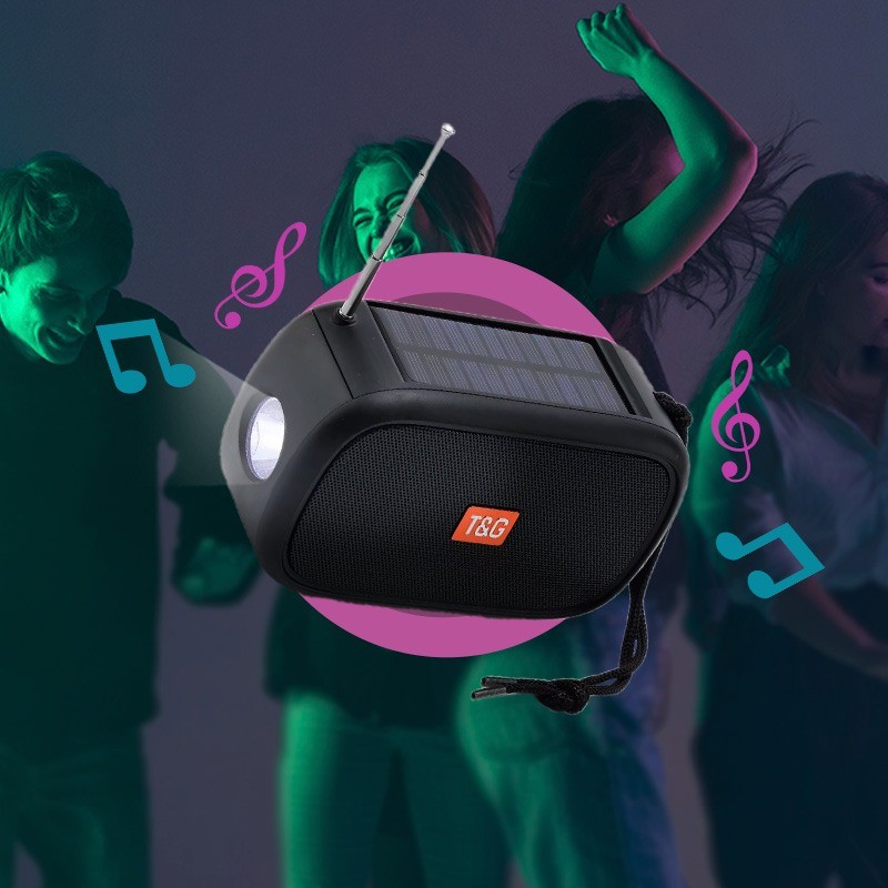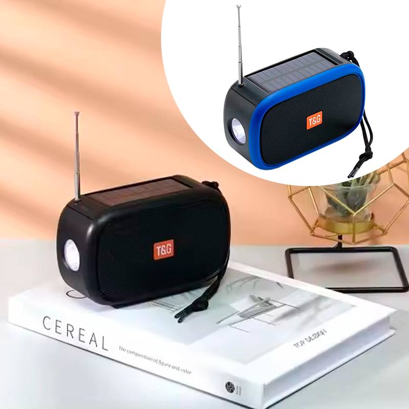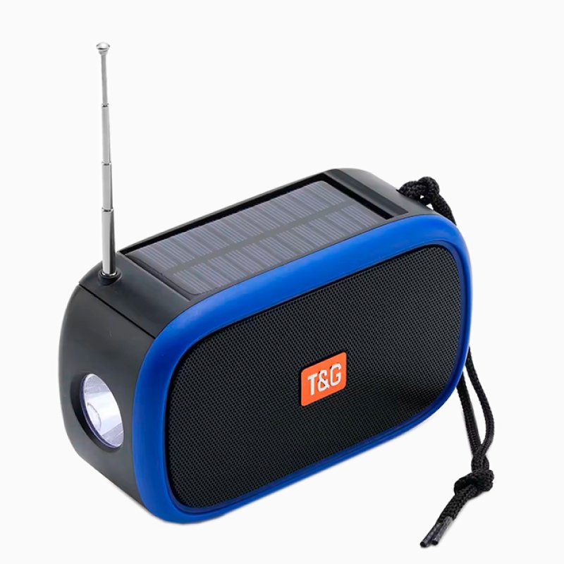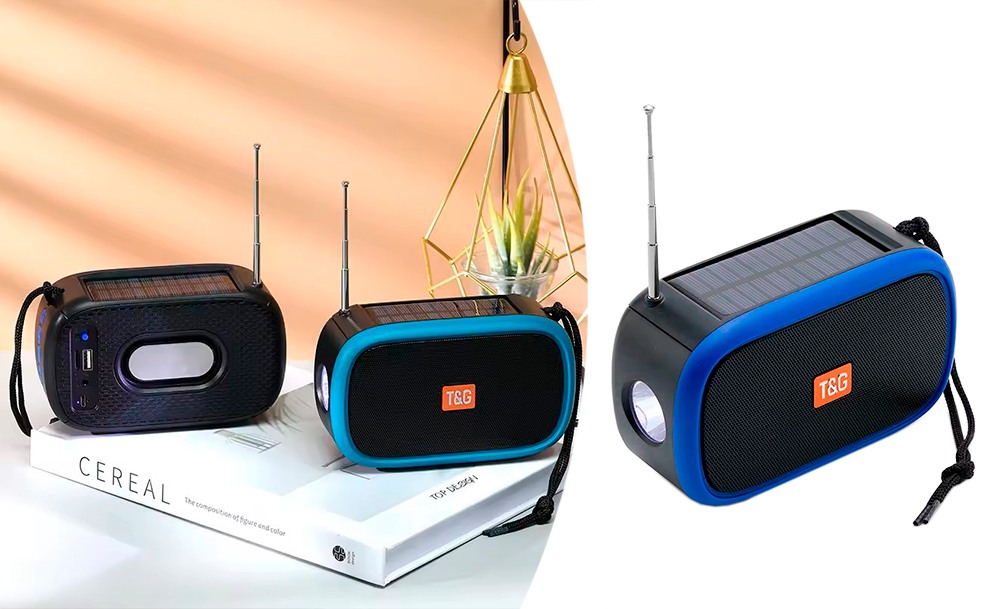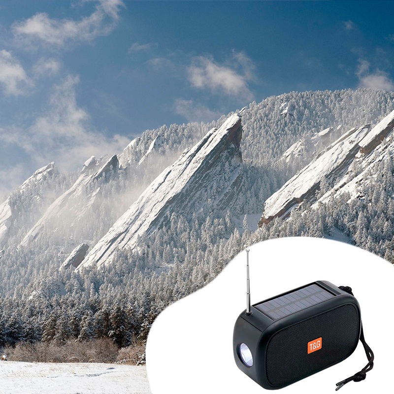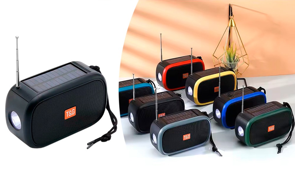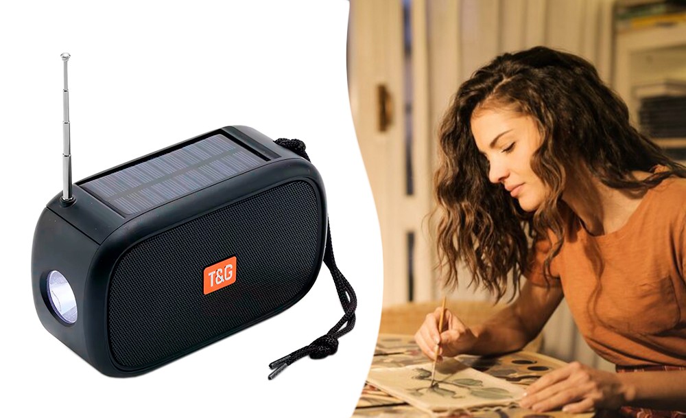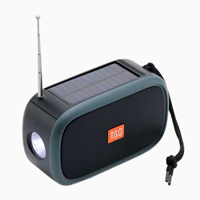 Bluetooth-колонка TG632 c радио, фонарем, солнечной батареей и громкоговорителем – это универсальная система, совмещающая в себе качественный звук и яркое освещение. Встроенный аккумулятор заряжается через USB-кабель или солнечную панель, расположенную на корпусе сверху.