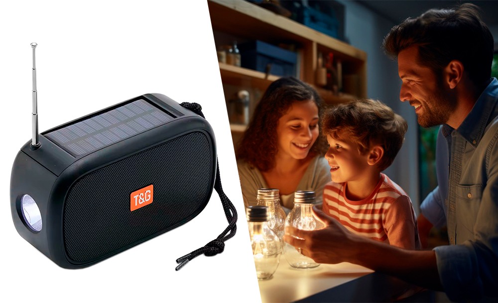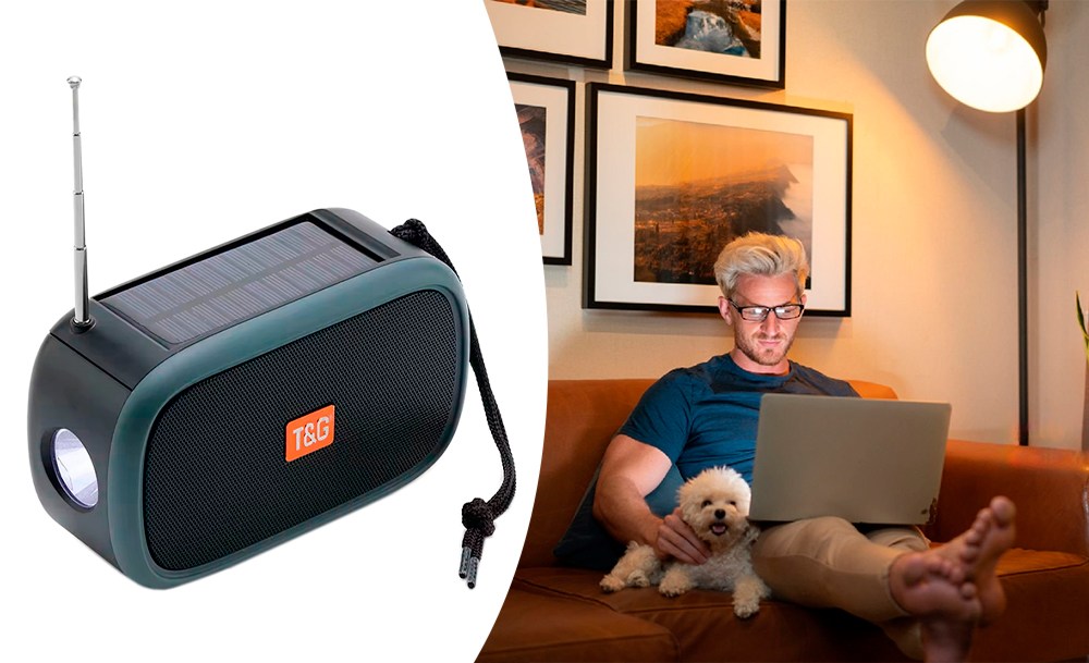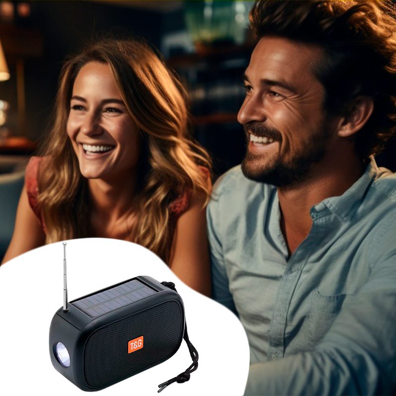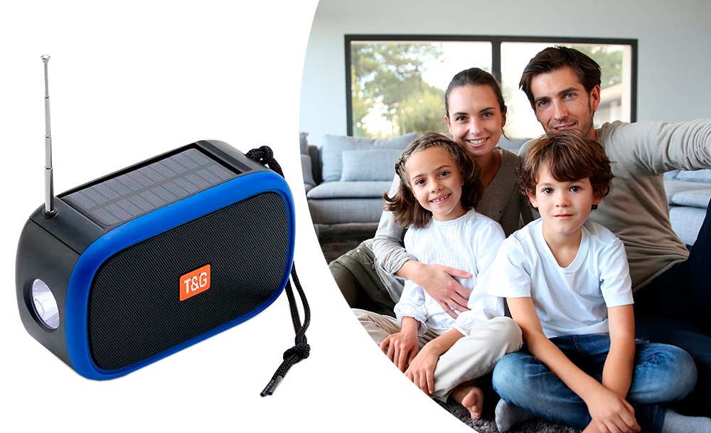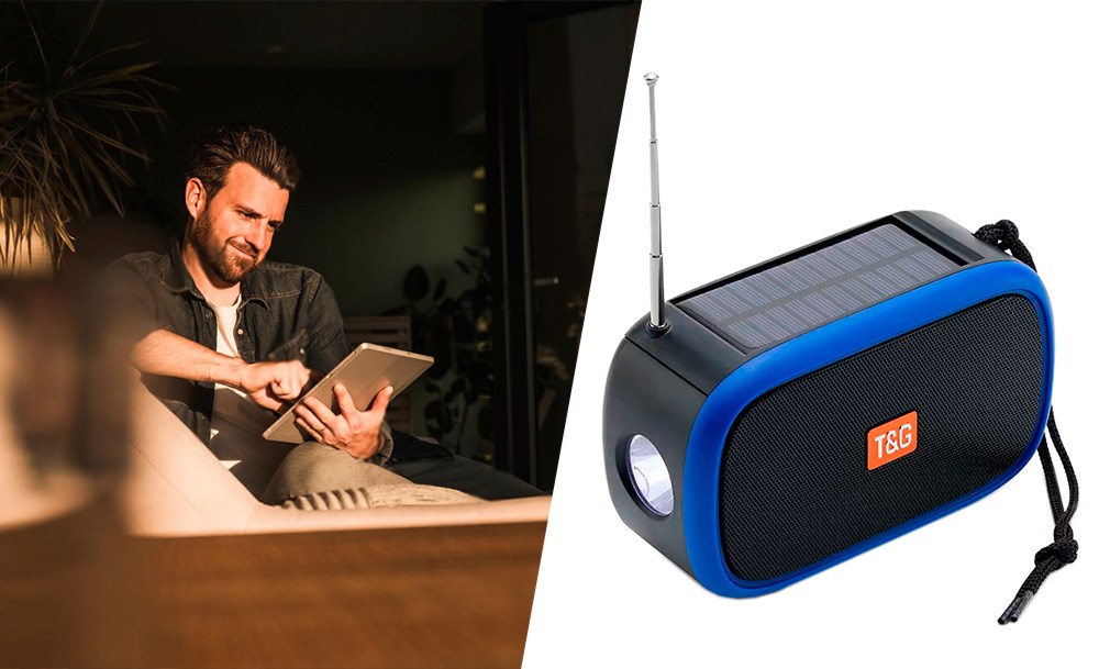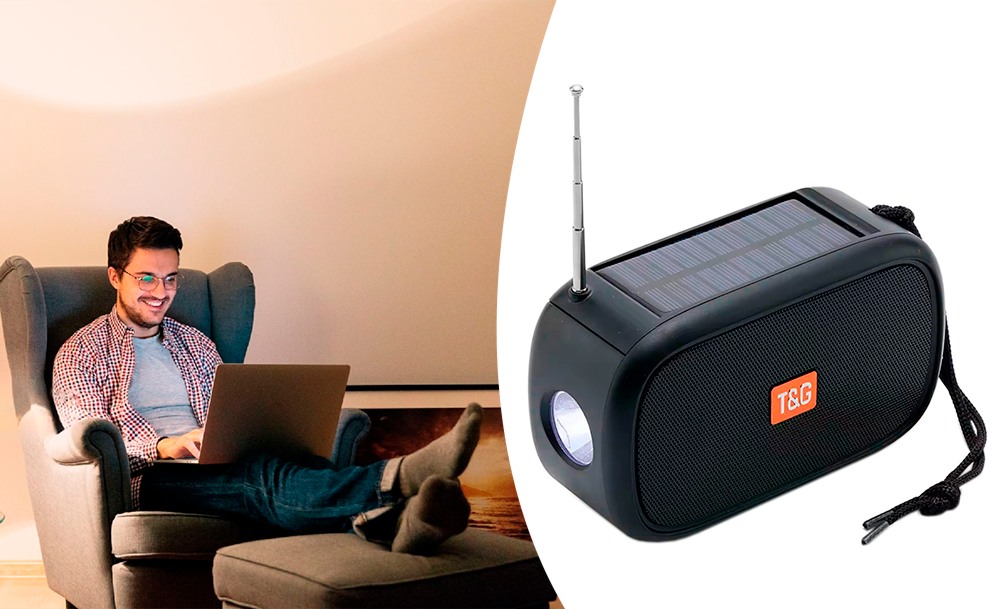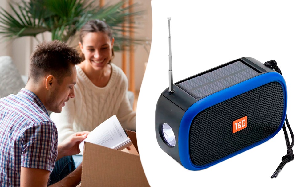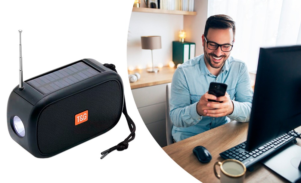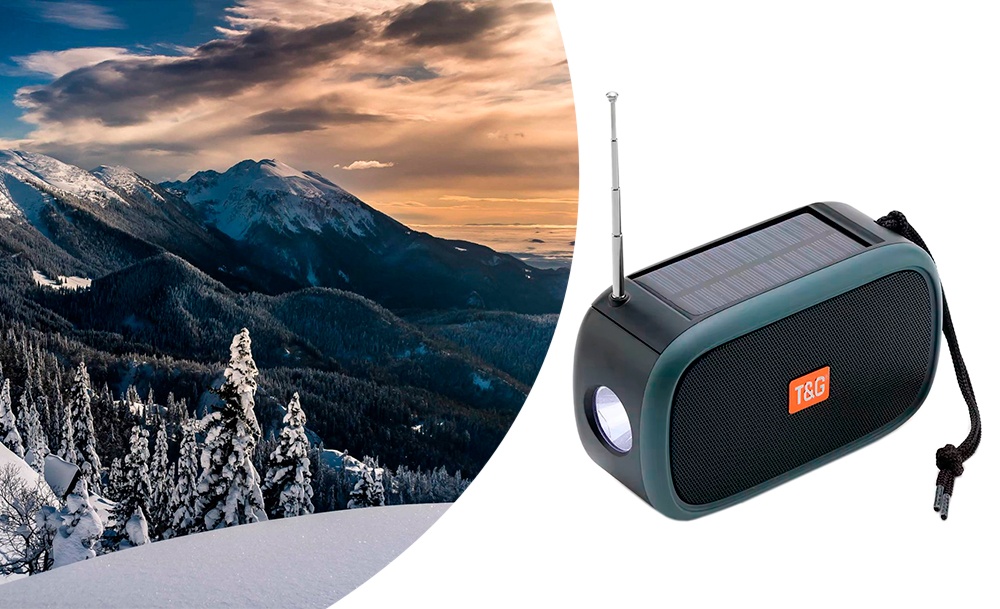 Bluetooth-колонка TG632 c радио, фонарем, солнечной батареей и громкоговорителем – это универсальная система, совмещающая в себе качественный звук и яркое освещение. Встроенный аккумулятор заряжается через USB-кабель или солнечную панель, расположенную на корпусе сверху.