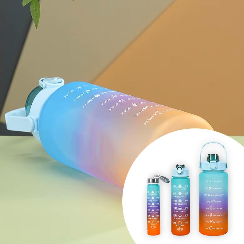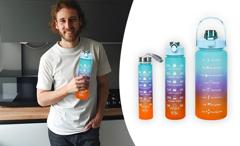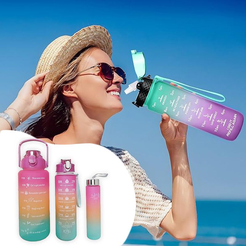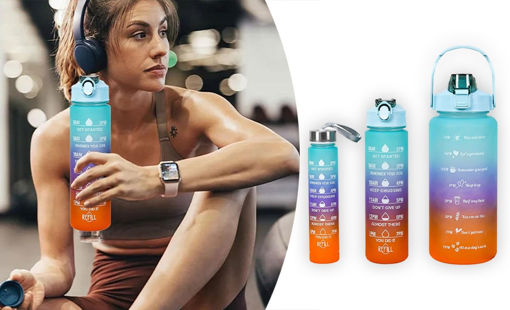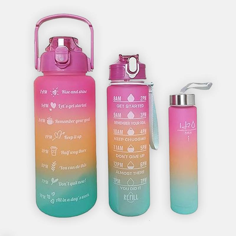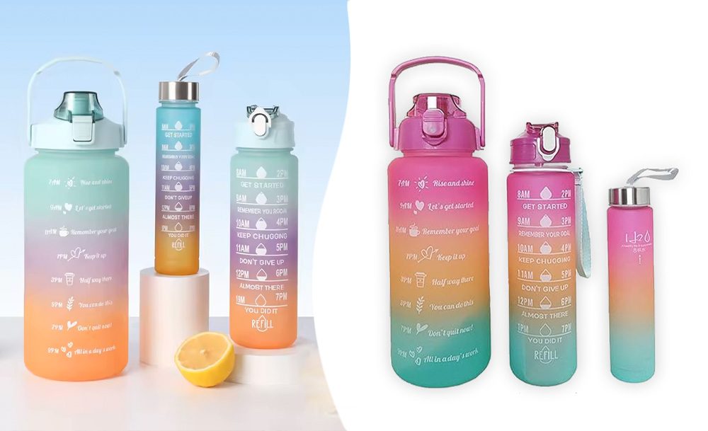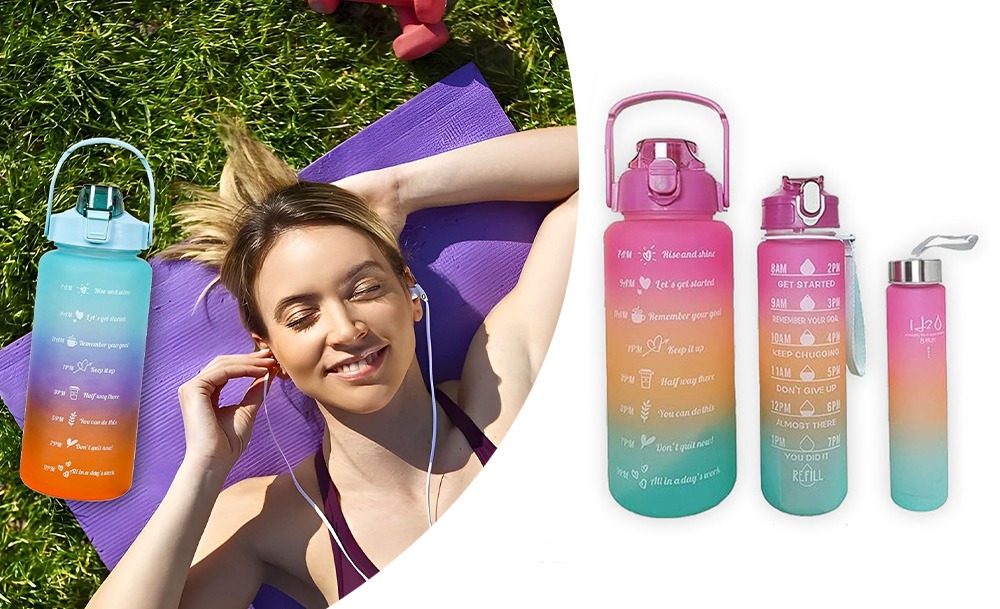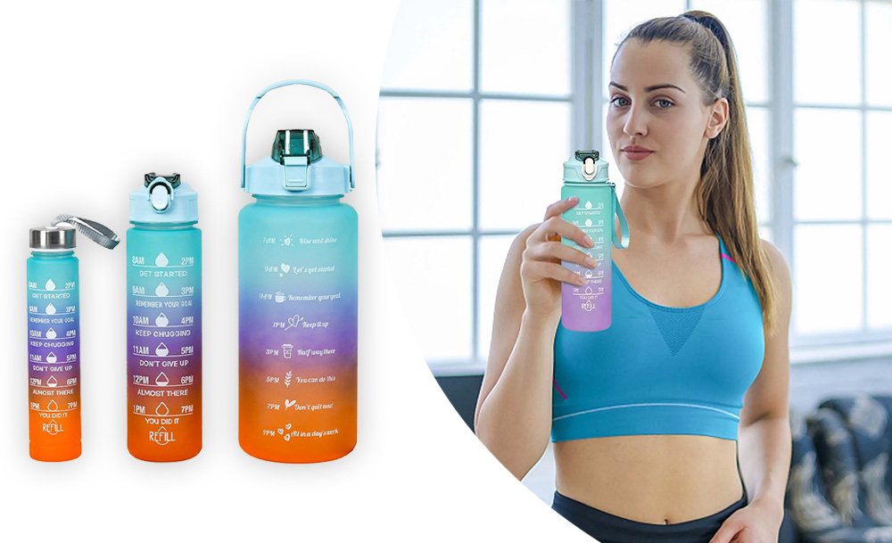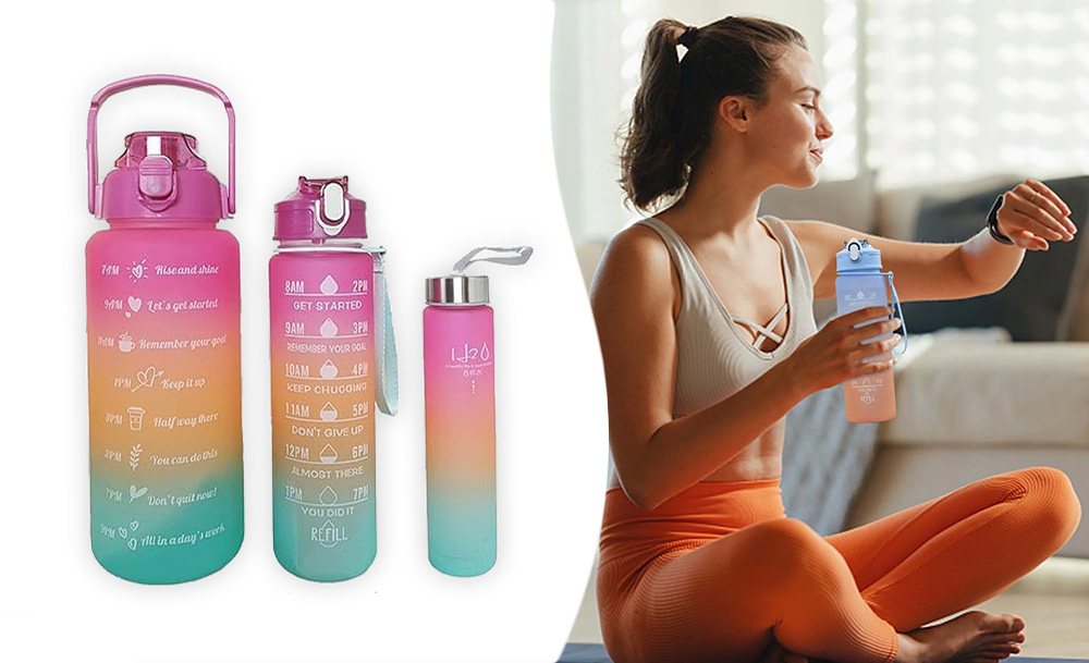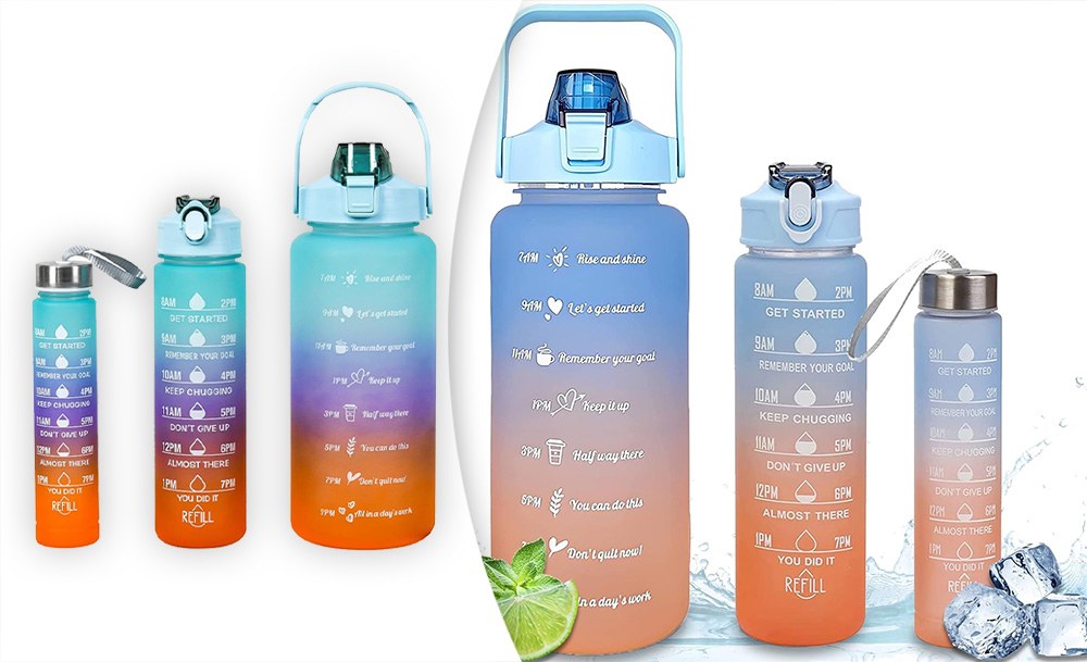 Набор спортивных бутылок 3 в 1 – это особые бутылки с маркерами часов и мотивирующими фразами! На бутылках есть шкала-маркеры, показывающие, сколько воды нужно выпить и до какого часа. Такие бутылки – настоящие помощники для всех, кто желает поддерживать правильный баланс воды в организме!