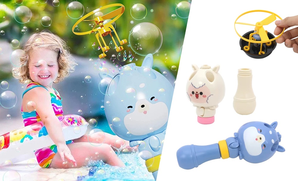 В комплекте — мыльные пузыри Booble Toy, которые создают крепкие, большие и блестящие пузырьки. Раствор не раздражает кожу и приятно пахнет. Просто залей жидкость, нажми кнопку — и веселье начинается. Отлично подойдёт для праздников, пикников и активных прогулок.