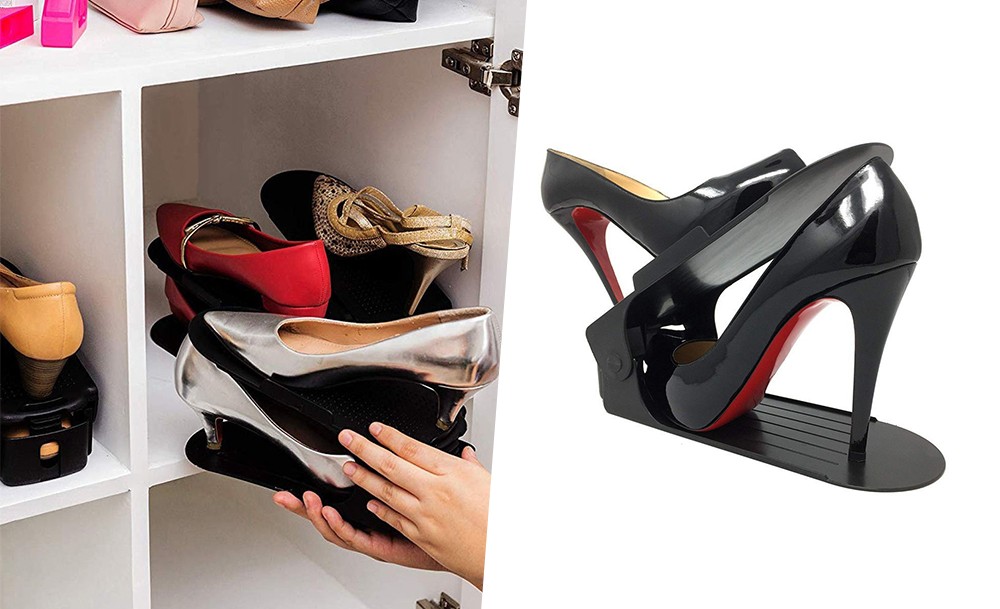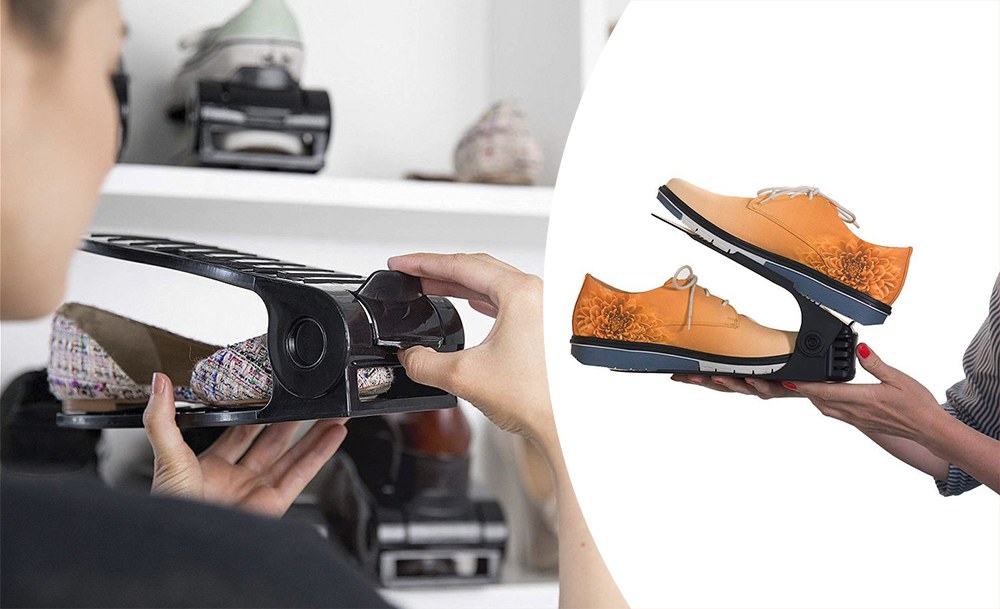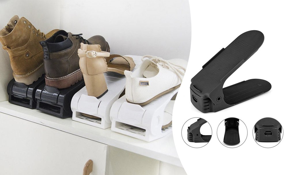 Двойная подставка для обуви изготовлена из качественного пластика и обеспечивает экономию места ровно в два раза. Подходит для невысокой обуви всех размеров. Многоразовая крепежная лента из силикона отлично подходит для размещения предметов и различных устройств на поверхностях с любыми углами наклона.