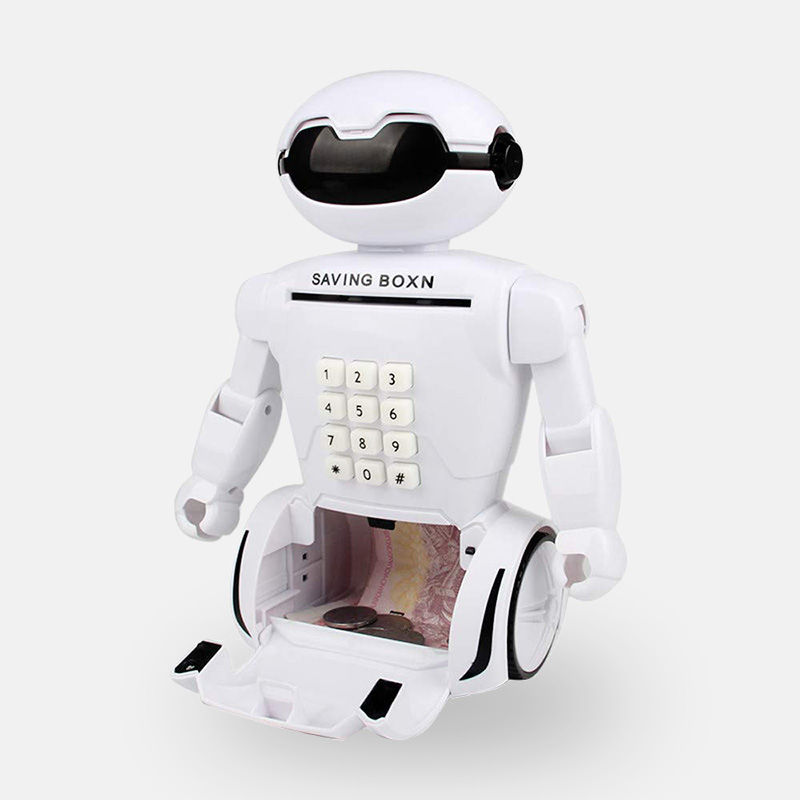 В него можно положить (а точнее он сам их проглатывает) как бумажные деньги, так и монеты, а потом, когда понадобится достать деньги, надо просто ввести свой установленный код и откроется передняя крышка. Ваш ребенок будет в восторге от такого робота и к тому же он будет использовать его как копилку для своих личных денег.