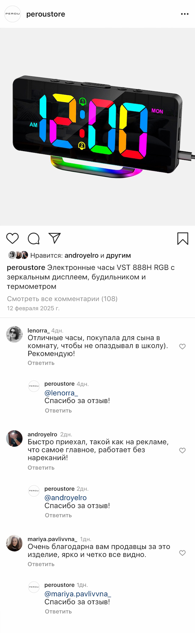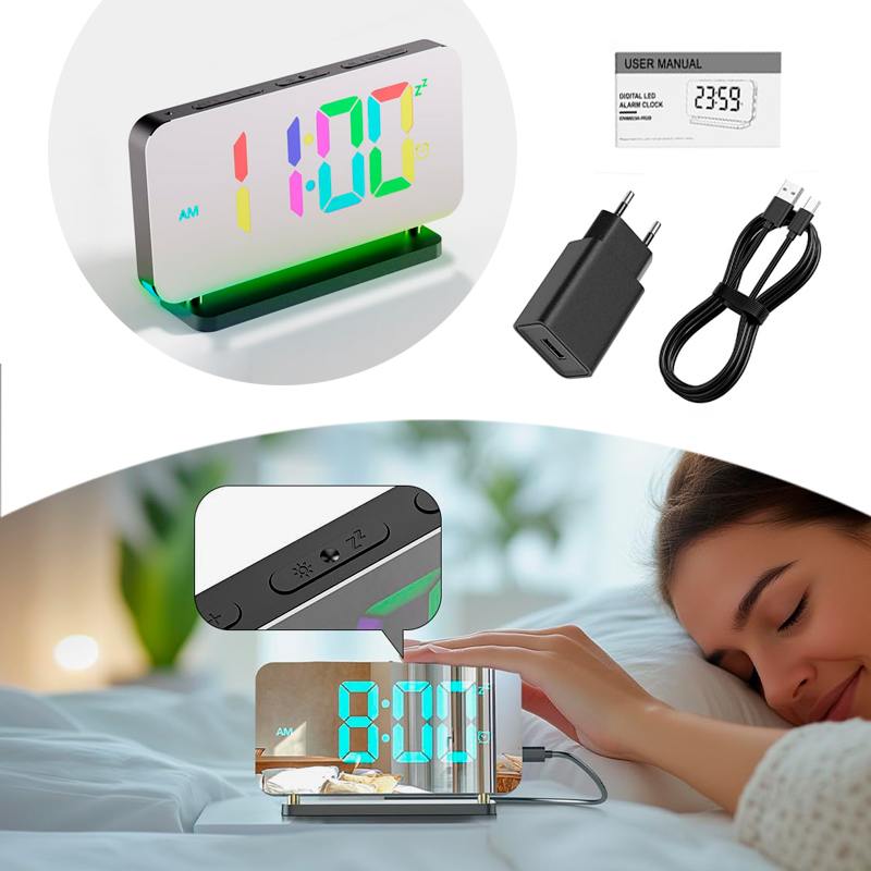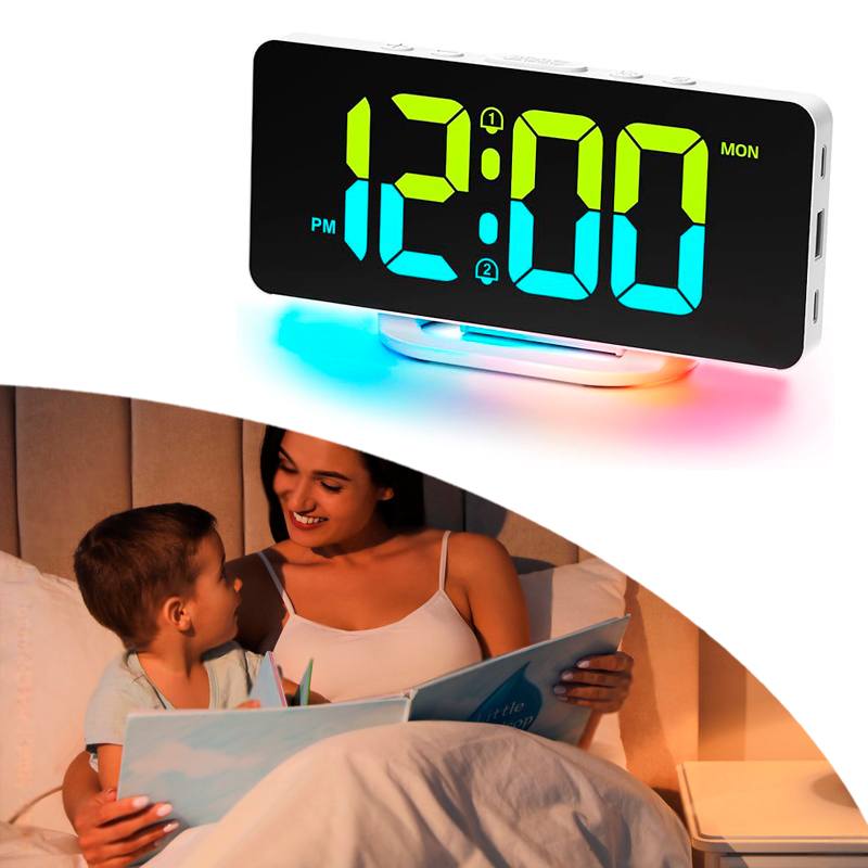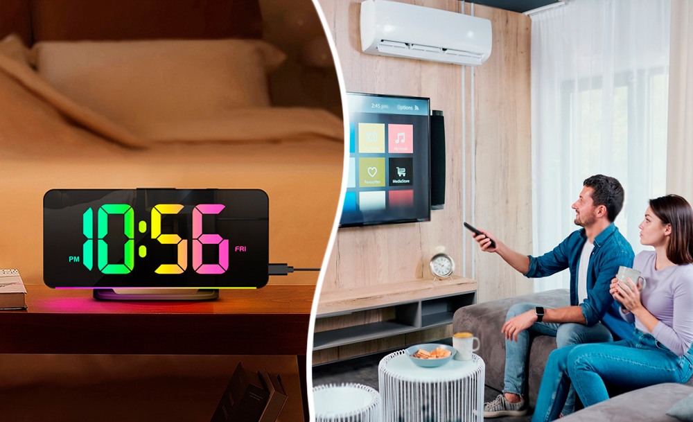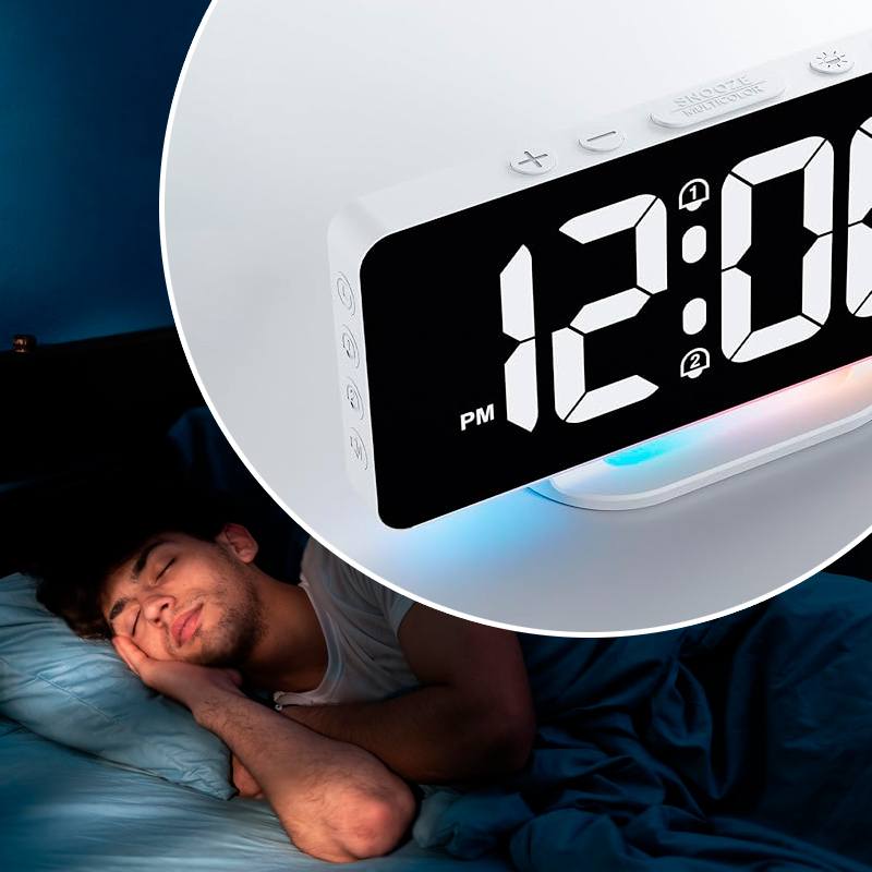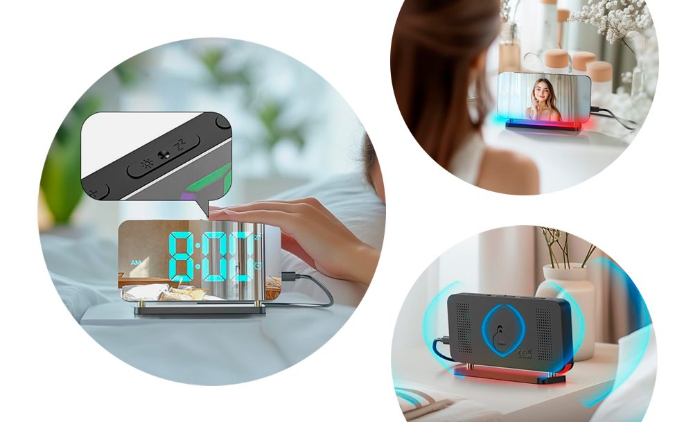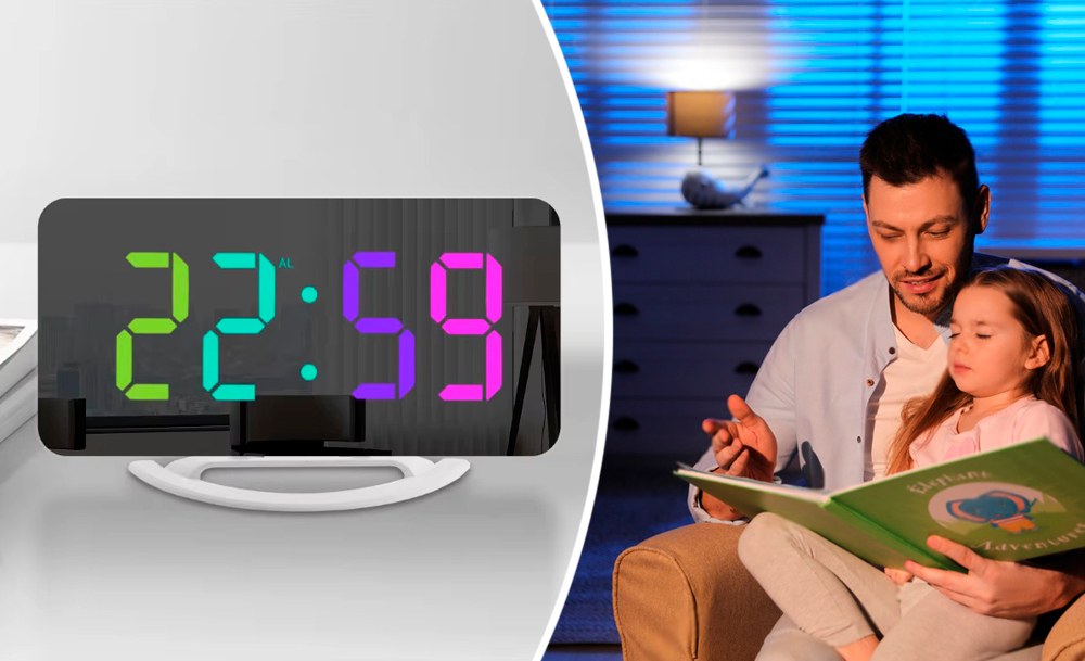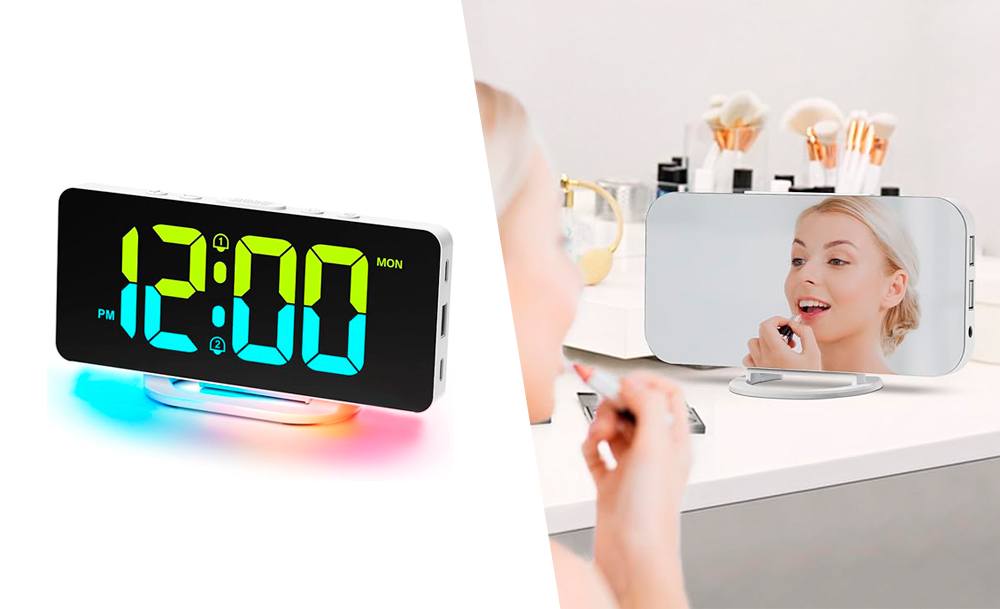 Их современный зеркальный дисплей с RGB подсветкой добавляет элегантности и создает неповторимую атмосферу в любом помещении. Подсветка автоматически уменьшается с 20:00 до 7:00, что удобно для сна.