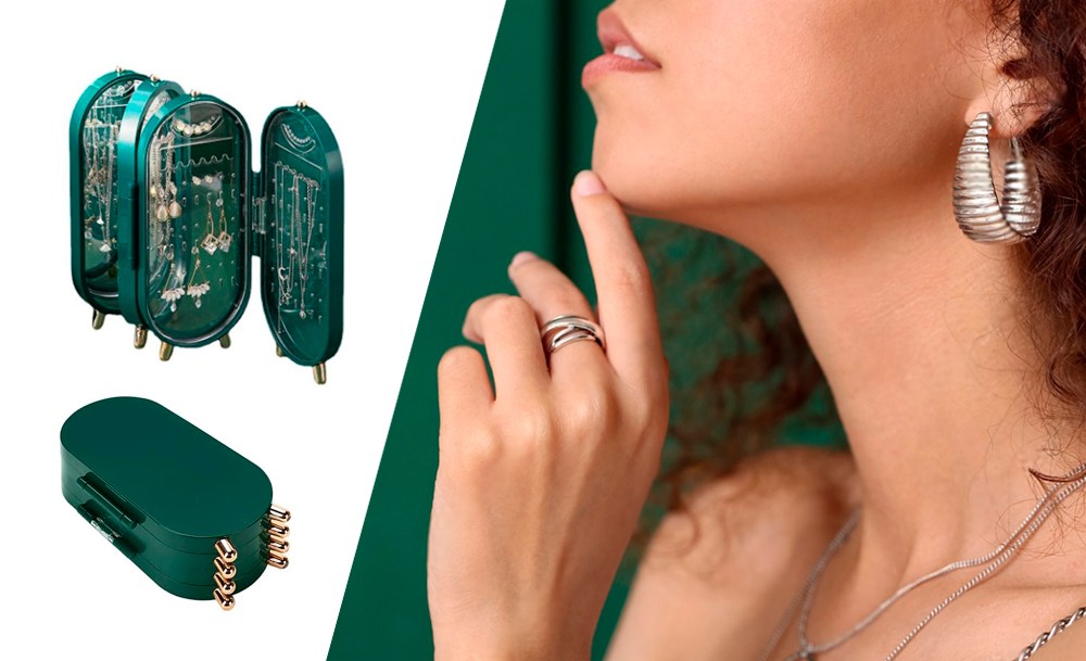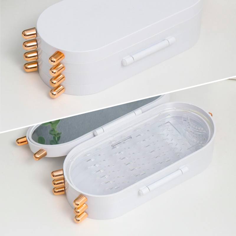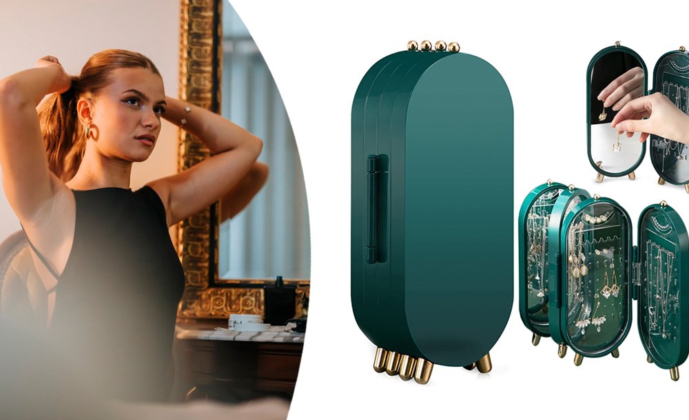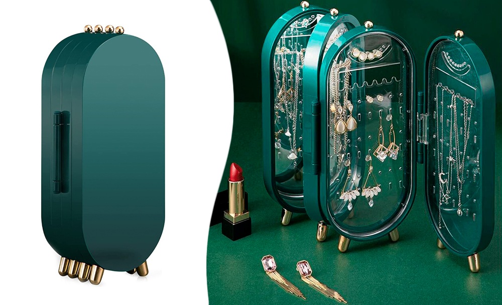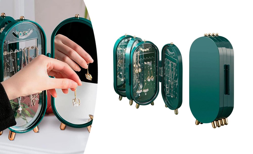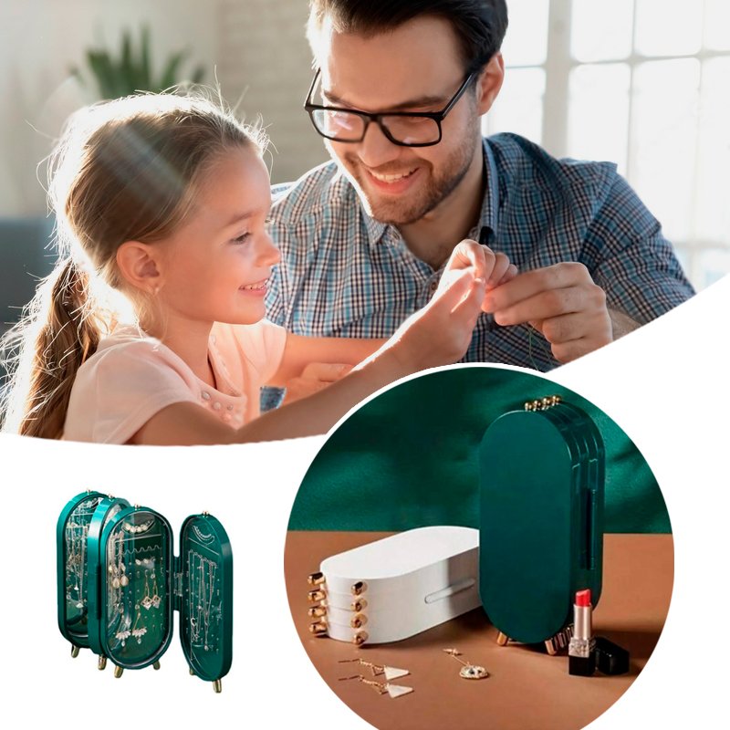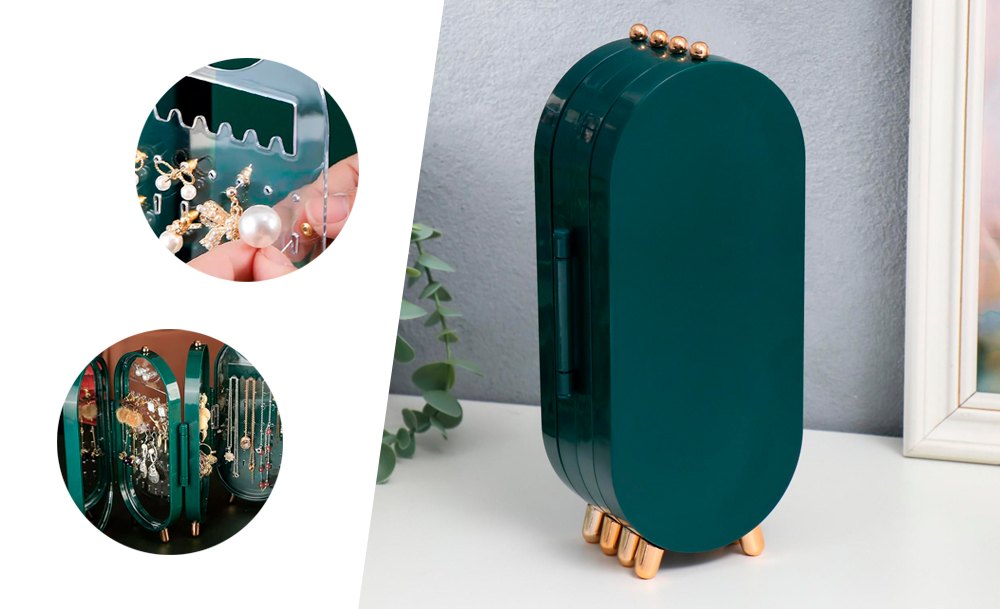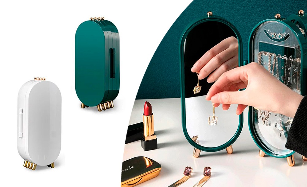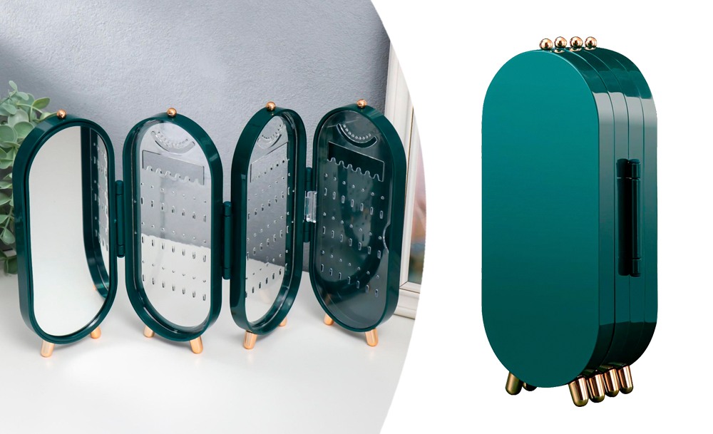 Футляр-органайзер Jewelry Storage Box для хранения ювелирных украшений, складная ювелирная шкатулка с зеркалом. Благодаря различным отделениям, вы сможете разместить серьги, браслеты, колье и другие украшения, не беспокоясь о их путанице.