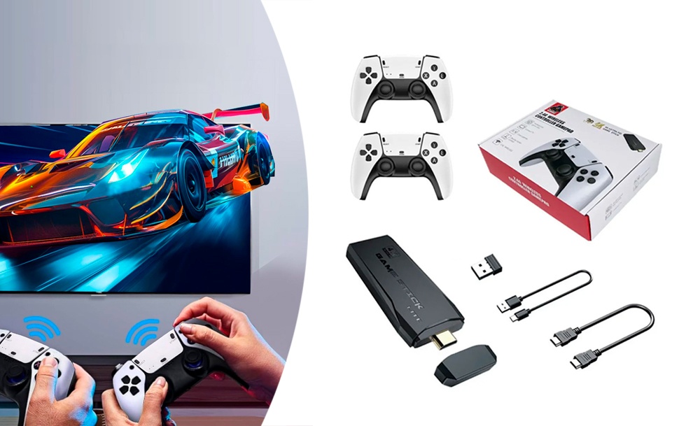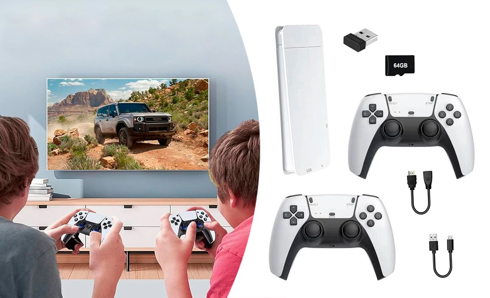 В комплект входят два джойстика, HDMI адаптер, TF карта 64 ГБ на 10000 игр, переходник на разъем HDMI, пульт и USB-кабель на Micro USB. Благодаря такому разнообразию подключения и большому функционалу M8 Pro становится незаменимой вещью для вашего досуга.