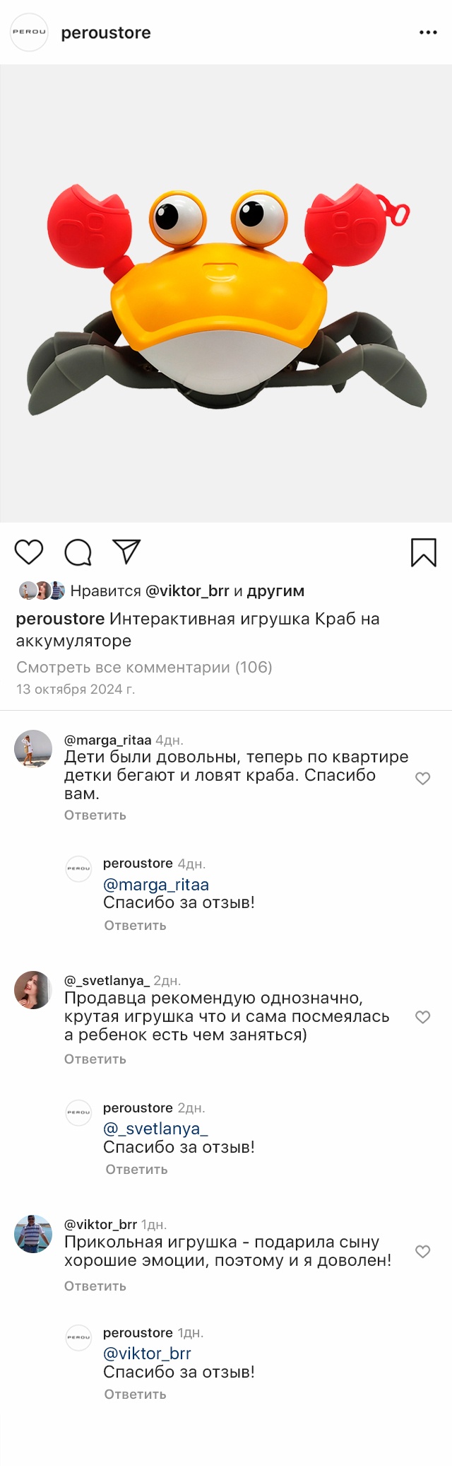 Она передвигается, имитируя движения настоящего краба, и обходит препятствия благодаря встроенным датчикам. Во время движения игрушка исполняет веселые песни, а глаза краба светятся. Маленькому ребенку будет интересно не только наблюдать за игрушкой, но и пытаться её поймать.