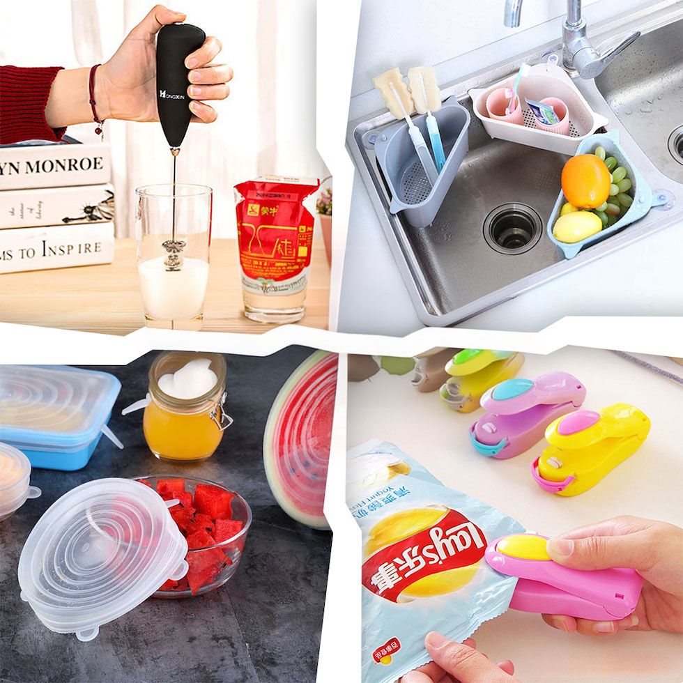 Эластичные силиконовые крышки подойдут для банок, кастрюль и других емкостей различных размеров. Герметично прилегают к бортику, удерживают жидкость внутри. Запайщик пакетов работает от батареек. Быстро и безопасно склеивает любые виды полимерных пленок.