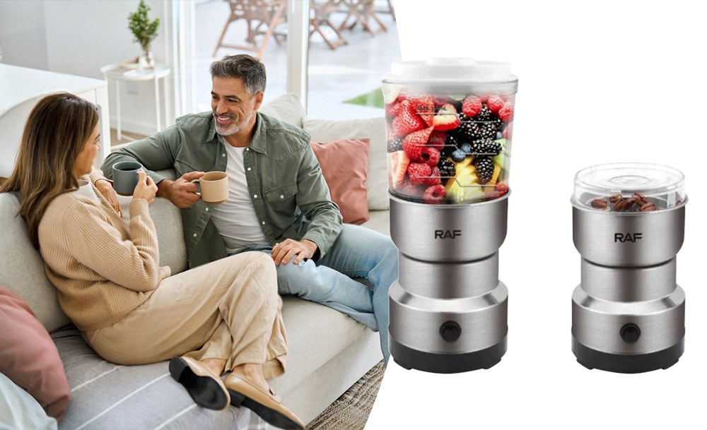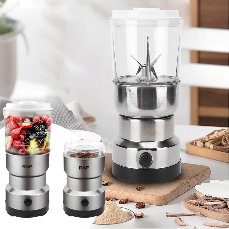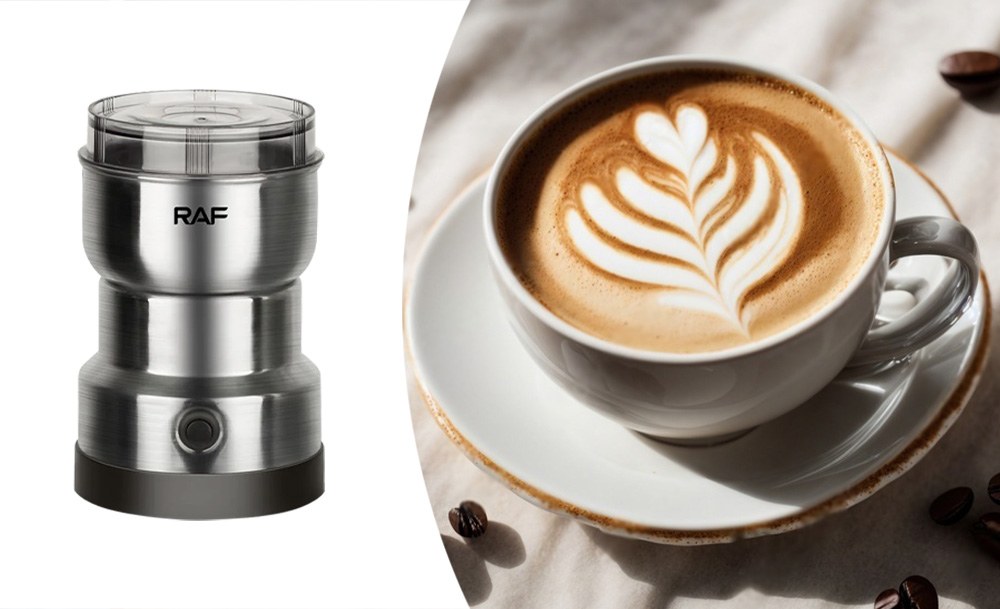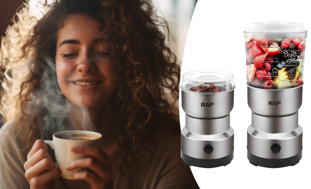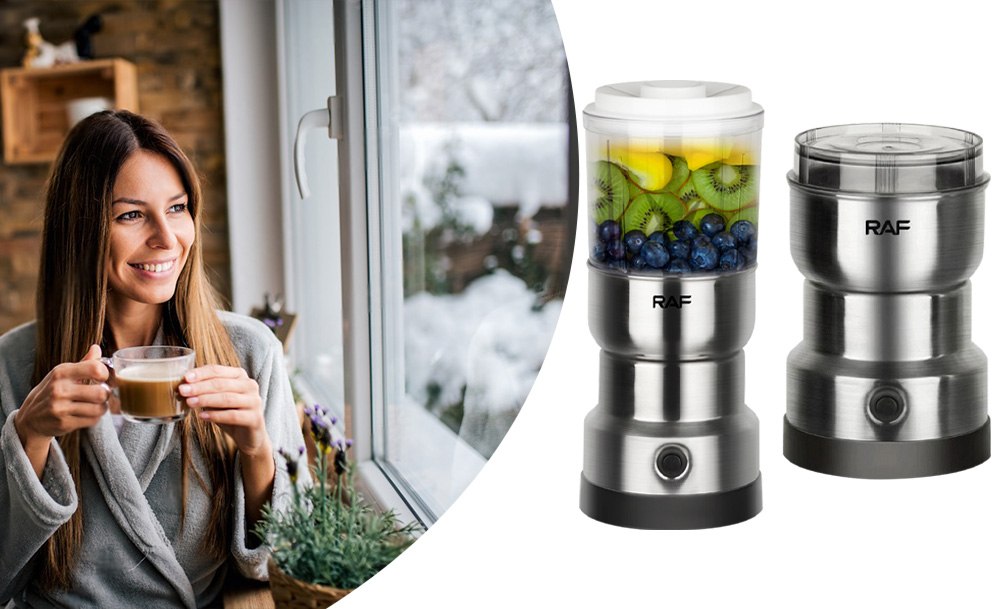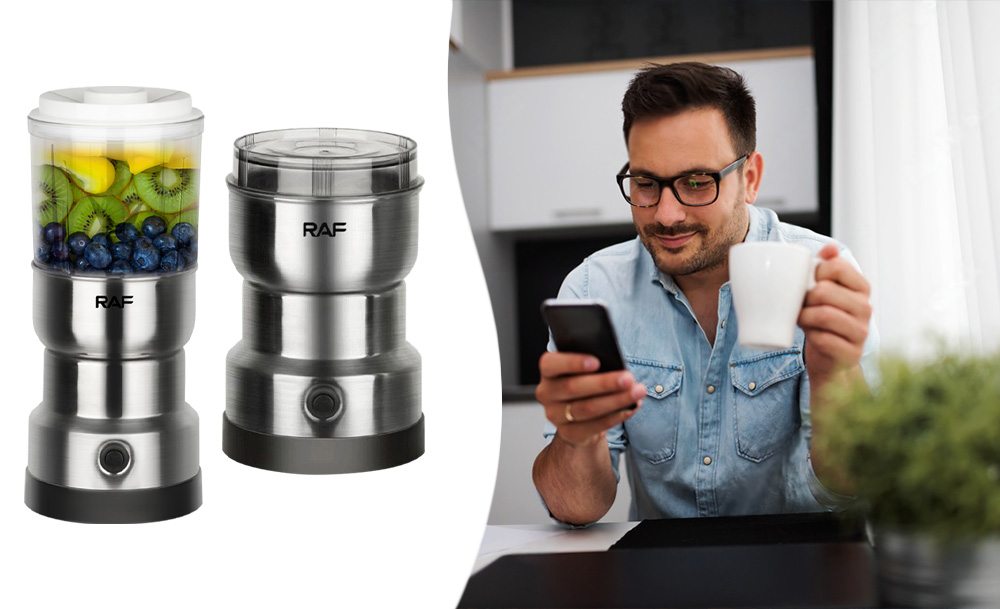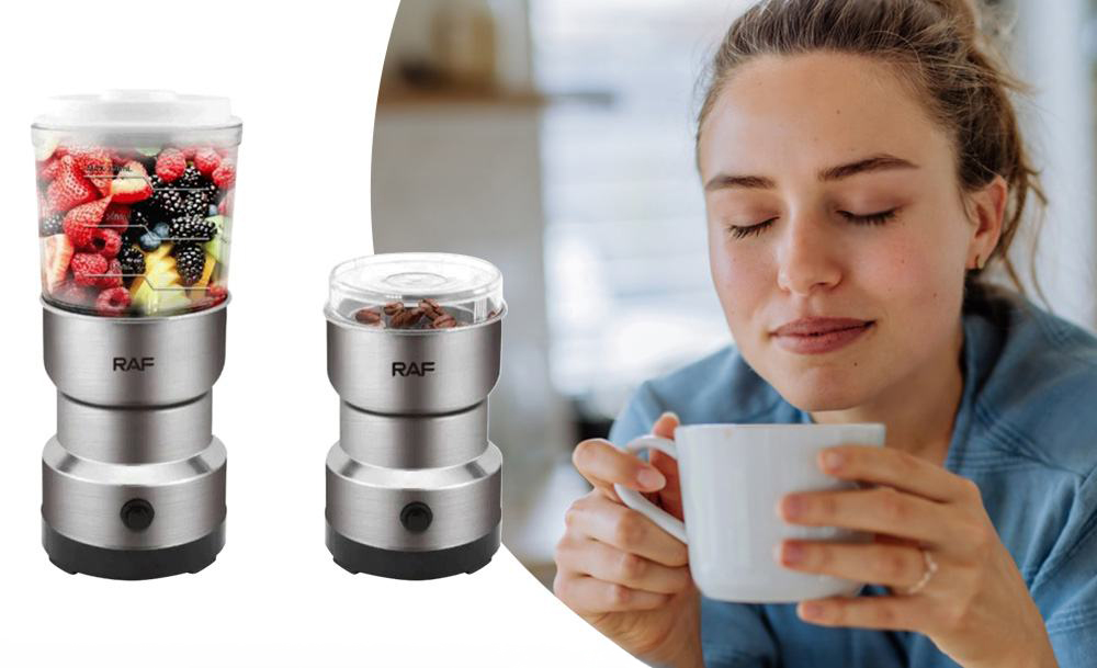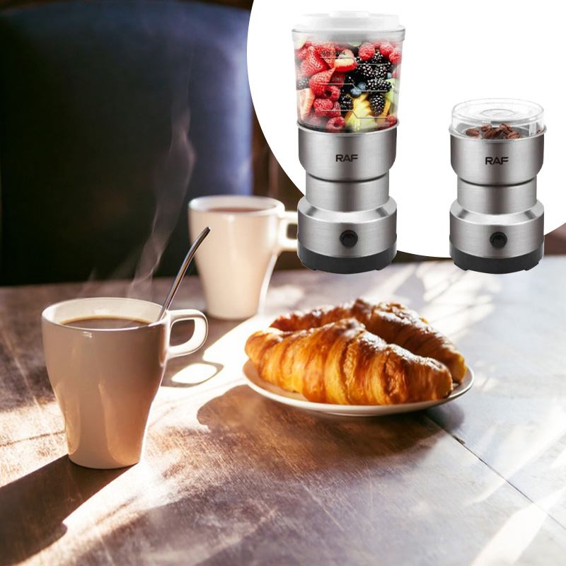 Кофемолка с блендером 2 в 1 RAF R-7126 — стильное и удобное решение для вашей кухни. Мощный мотор 300 Вт легко справляется с помолом кофе, орехов и специй, а прочная чаша из нержавеющей стали прослужит долго и легко очищается.