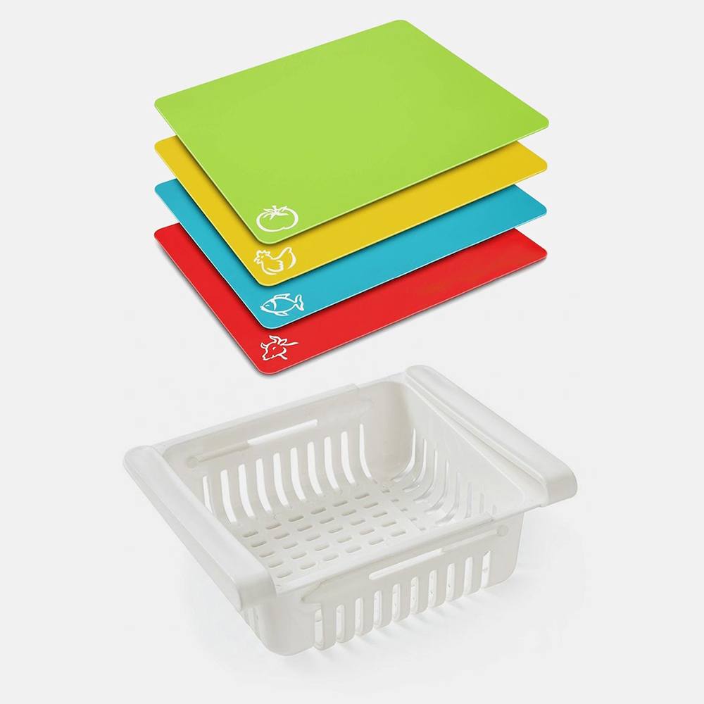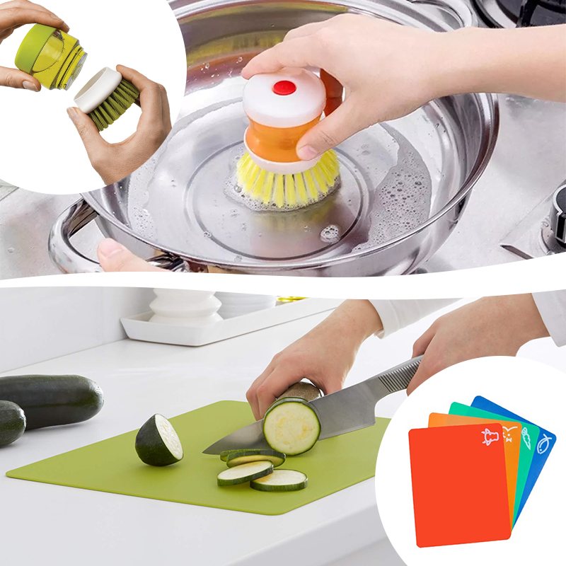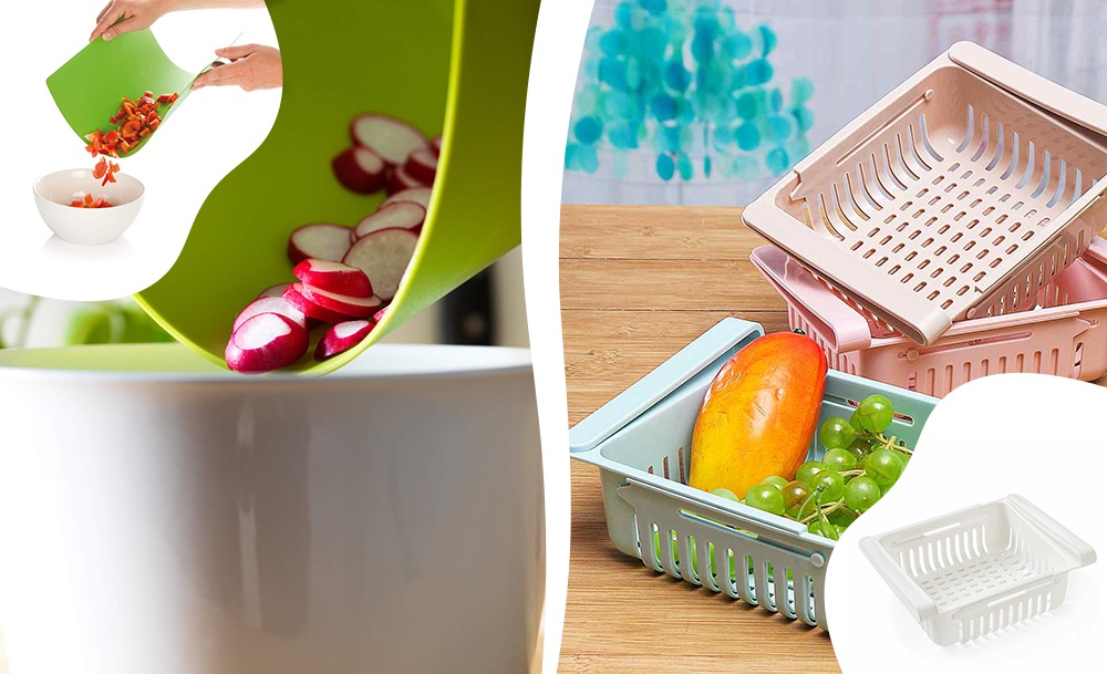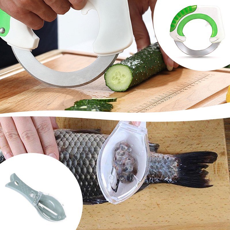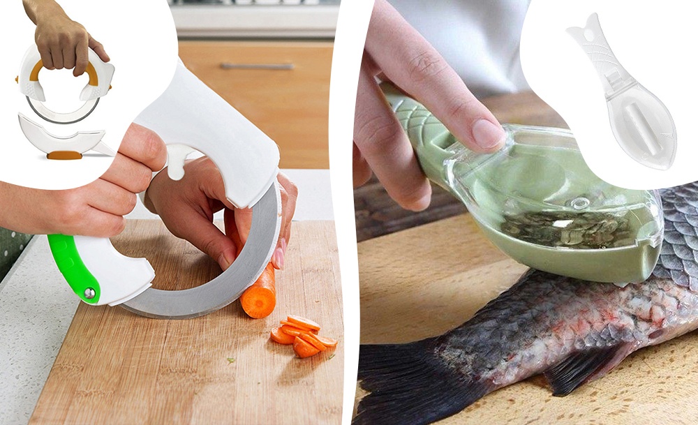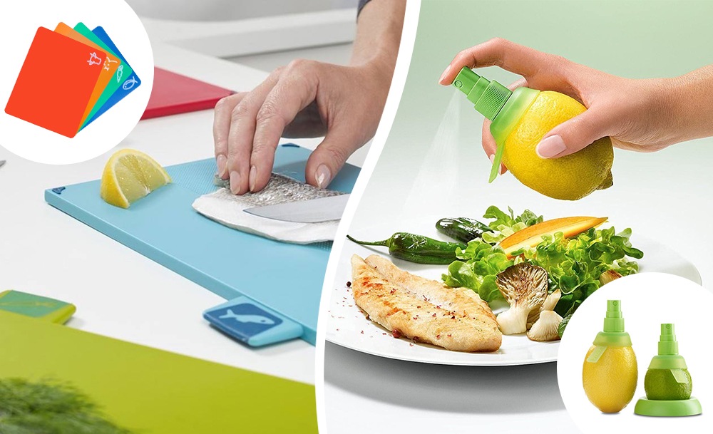 Круглый нож и рыбочистка с контейнером позволят готовить гораздо быстрее и оставят кухню чистой. Гибкие разделочные доски можно сворачивать и гнуть; благодаря специальной маркировке для разных продуктов, их невозможно перепутать.
