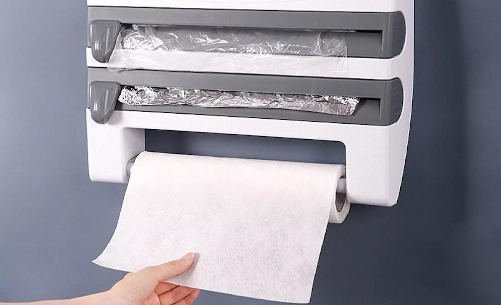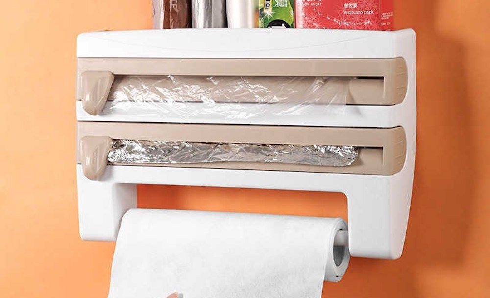 Кухонный органайзер 4 в 1 сочетает сразу несколько полезных функций. Держатель для бумажных полотенец – всегда под рукой, рулон можно легко снять и заменить. Держатель для алюминиевой фольги помогает быстро отмотать необходимое количество и отрезать специальным встроенным приспособлением. Держатель пищевой пленки снабжен пластиковой полосой, которая после отделения нужного куска не дает пленке завернуться обратно. Полочка для специй и мелких принадлежностей комфортно располагает их в доступном месте.