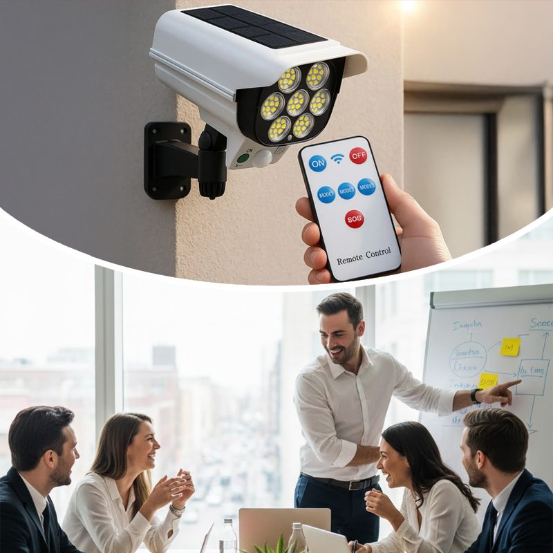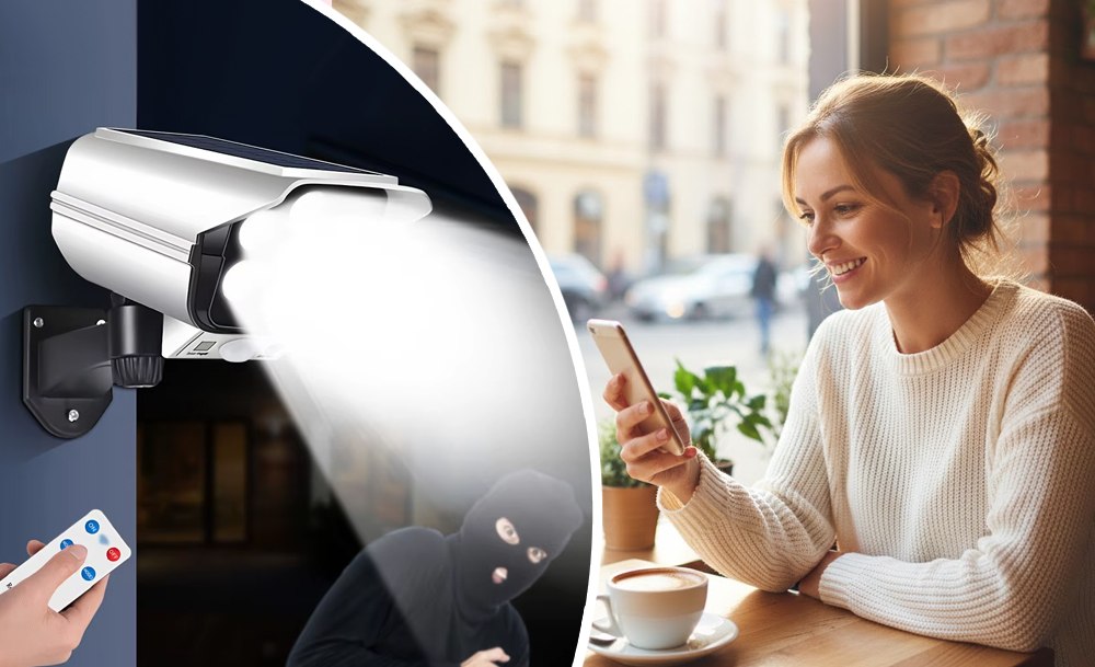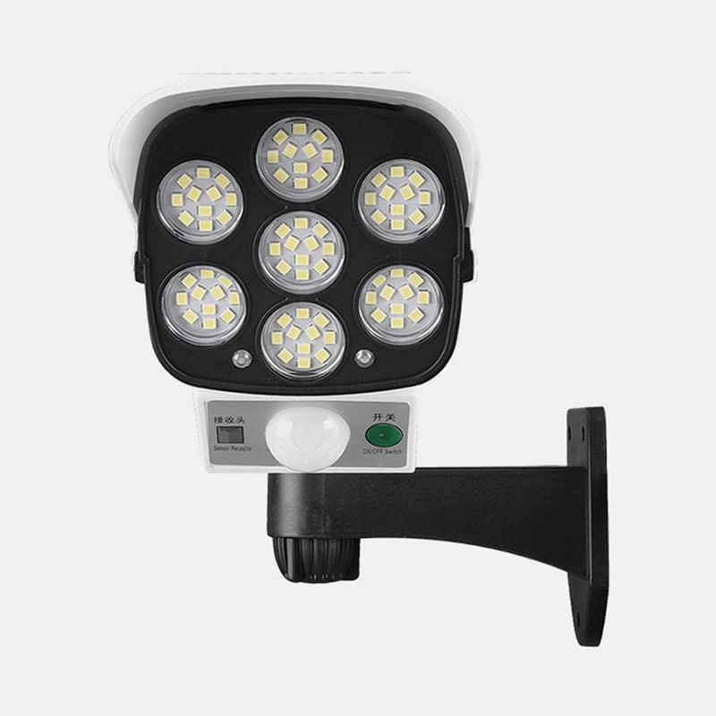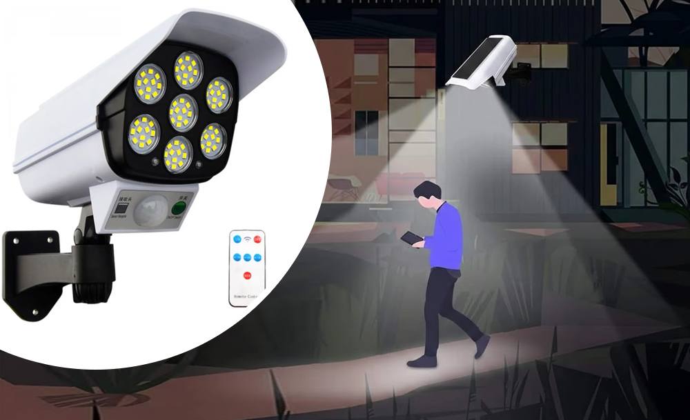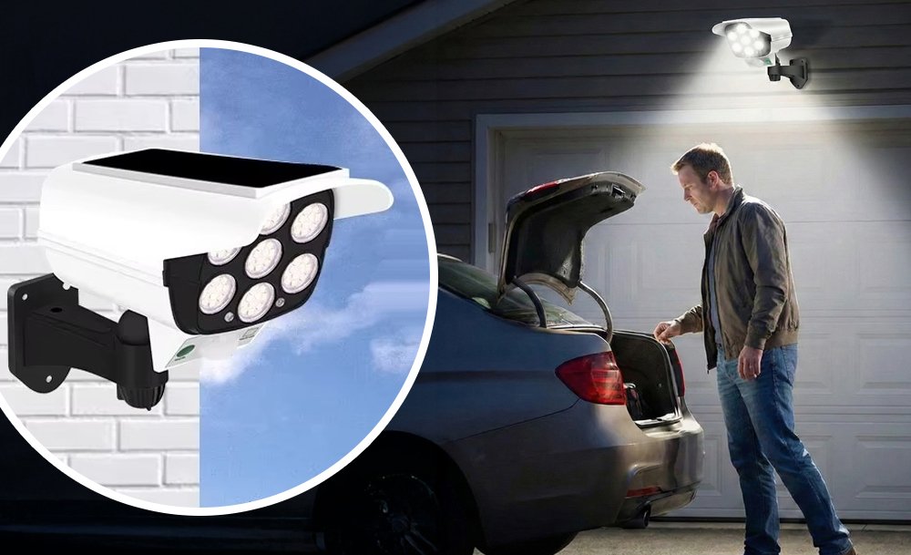 Главная особенность светильника – дизайн в виде камеры видеонаблюдения. Такой внешний вид сам по себе отпугивает нежеланных гостей. Инфракрасный датчик реагирует на движение на расстоянии нескольких метров. Водонепроницаемый корпус позволяет использовать прибор в любую погоду.