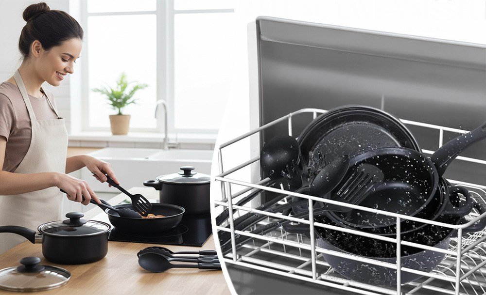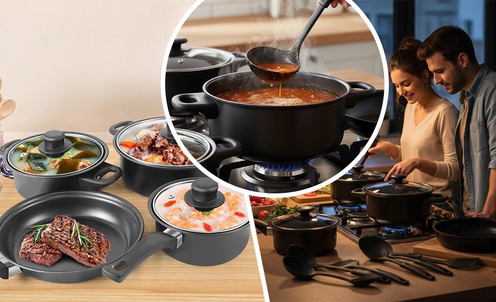 Прочное многослойное дно поддерживает равномерный нагрев, а антипригарное покрытие позволяет готовить почти без масла. Эргономичные ручки с термозащитой не нагреваются, поэтому не обжигают руки. Посуда легко моется, устойчива к царапинам и долго сохраняет аккуратный внешний вид. Подходит для всех типов плит, кроме индукционных.
