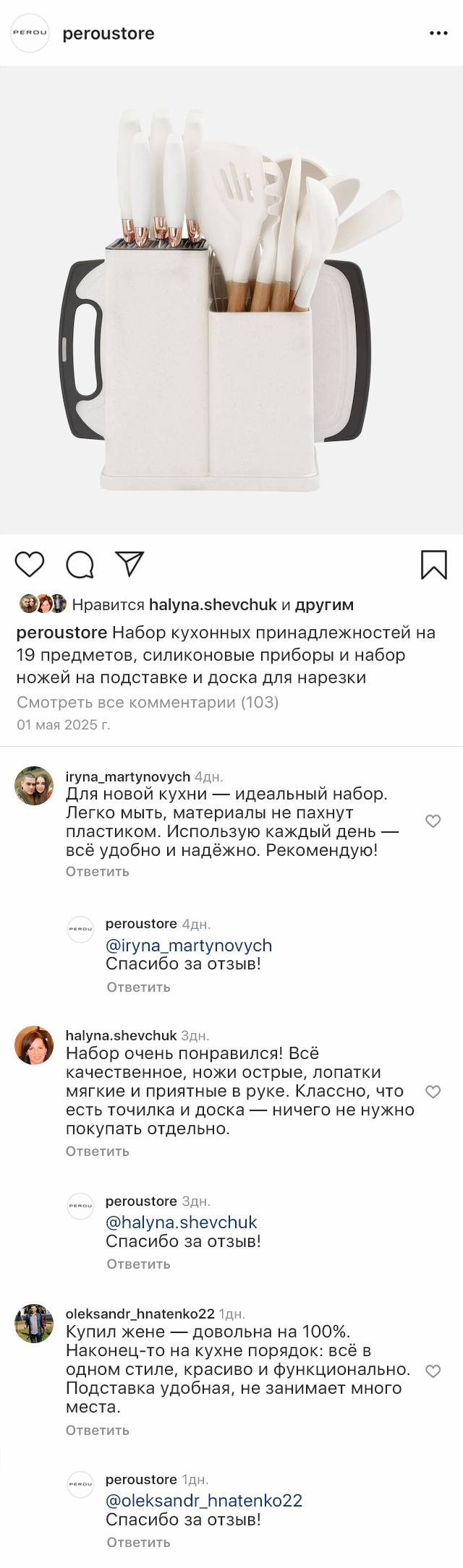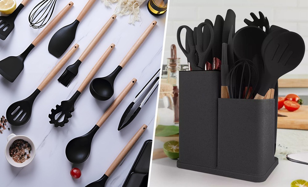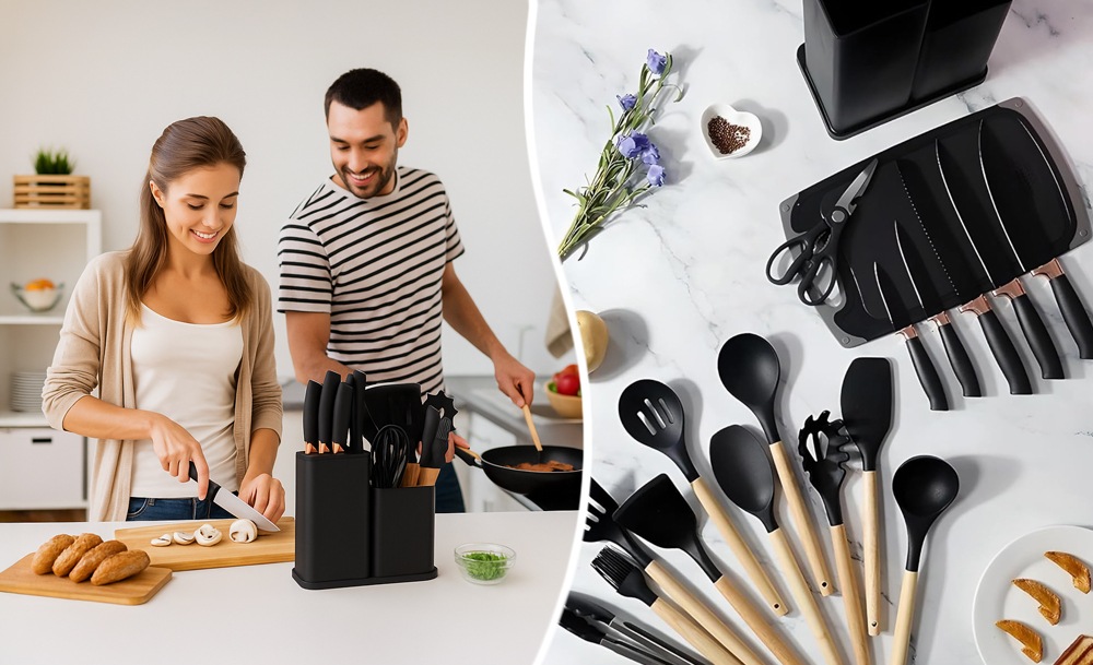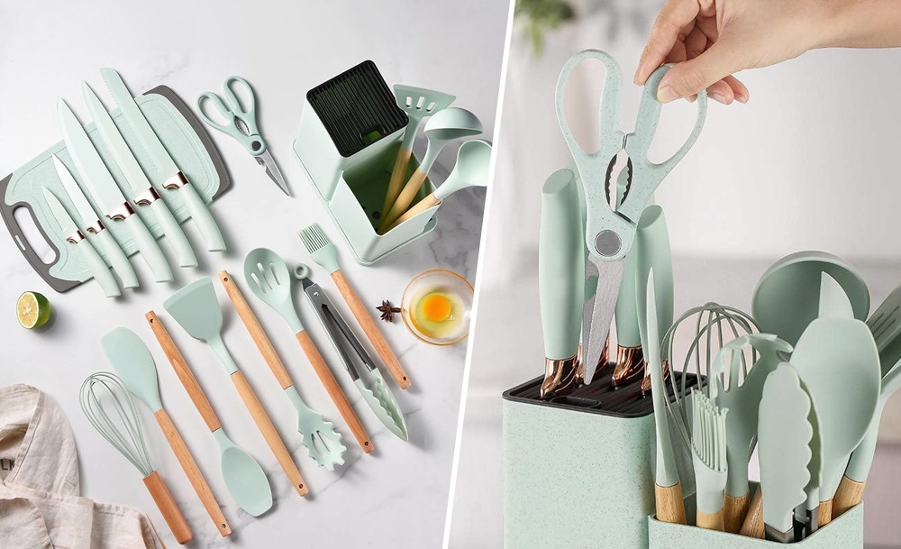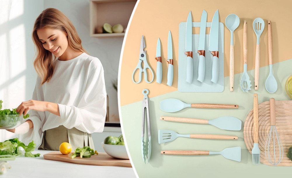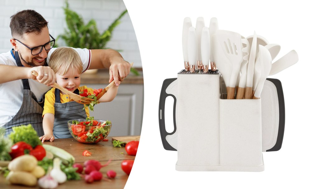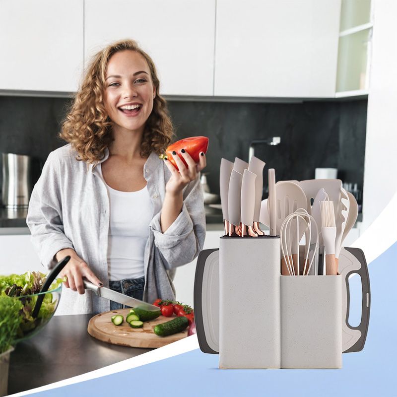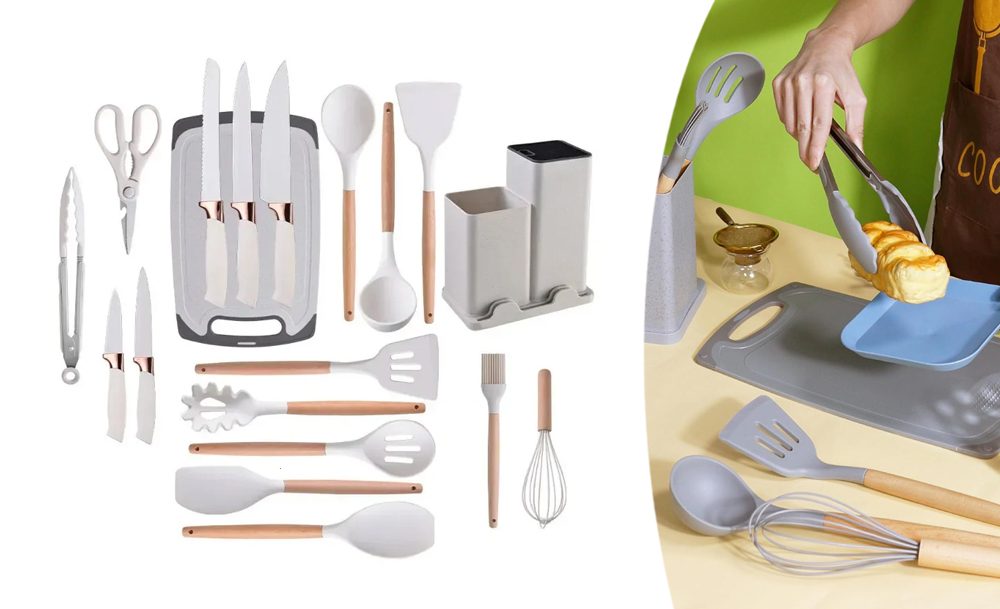 Набор включает в себя не только стандартные кухонные инструменты, такие как лопатки, ложки и веник, но и кухонные ножи, ножницы и доску для нарезки, что делает его универсальным решением для любых кухонных задач.