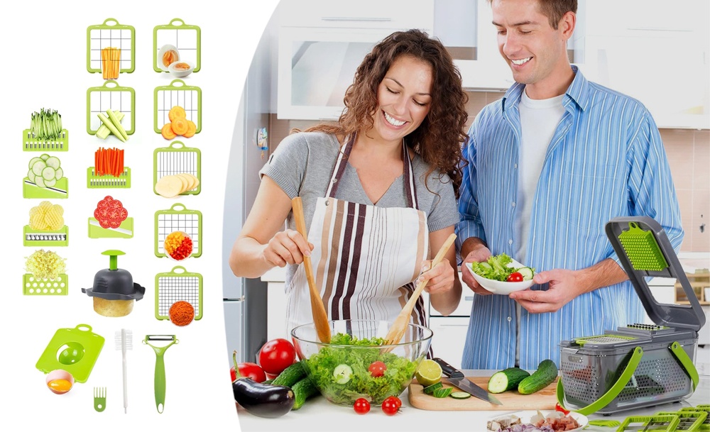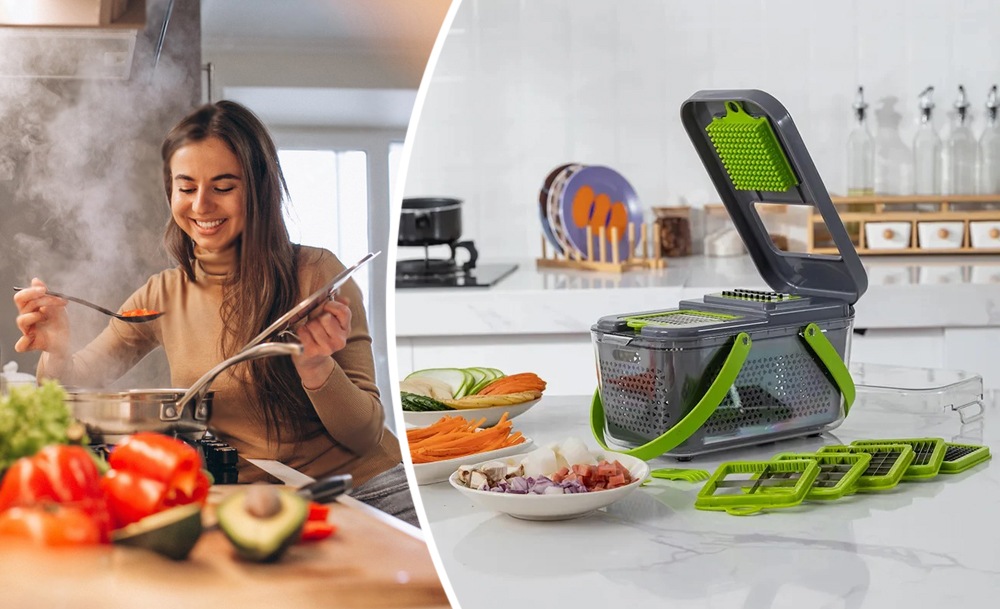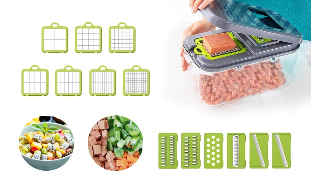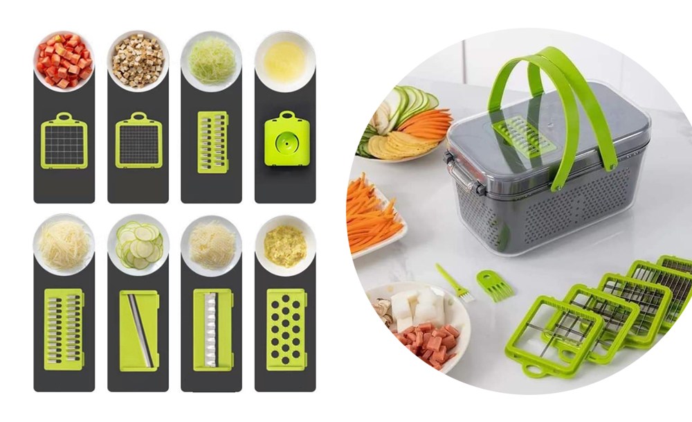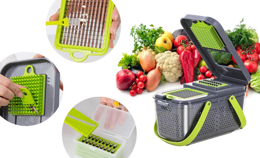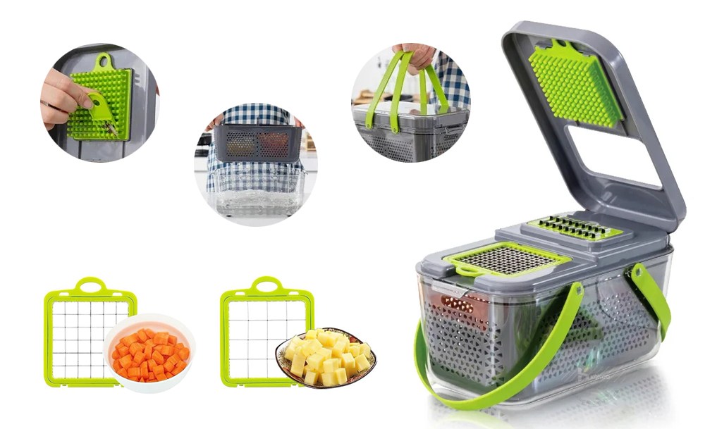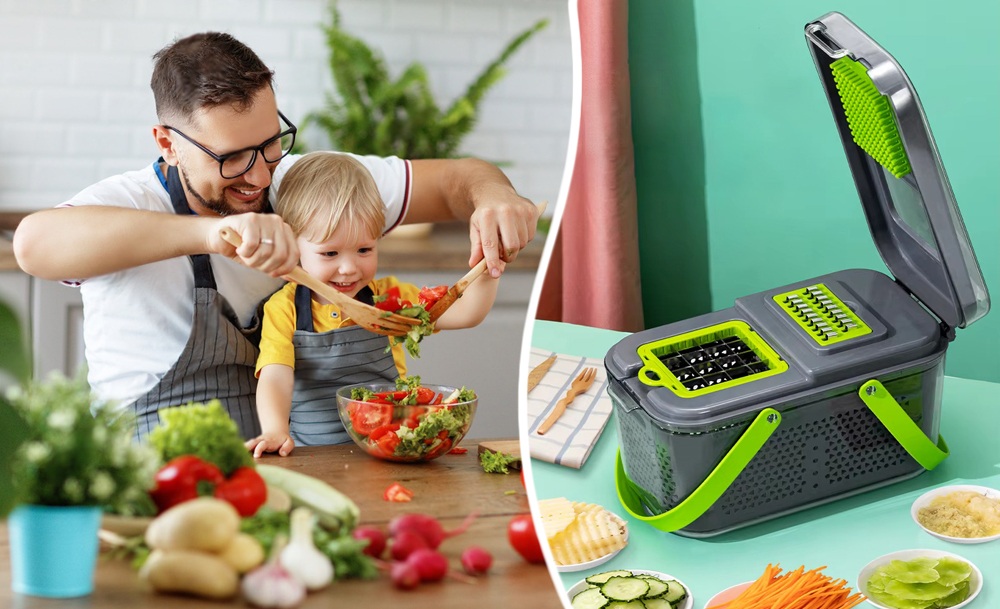 Овощерезка 22 в 1 Veggie Slicer — идеальный помощник на вашей кухне. Она объединяет в себе тёрку, слайсер, измельчитель и практичный контейнер. С помощью различных насадок вы с лёгкостью натрёте, нарежете или измельчите продукты в нужной форме. Всё компактно, безопасно и удобно. Прочная конструкция гарантирует долговечность. С Veggie Slicer готовка станет проще, быстрее и приятнее.