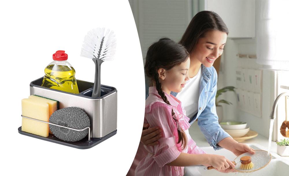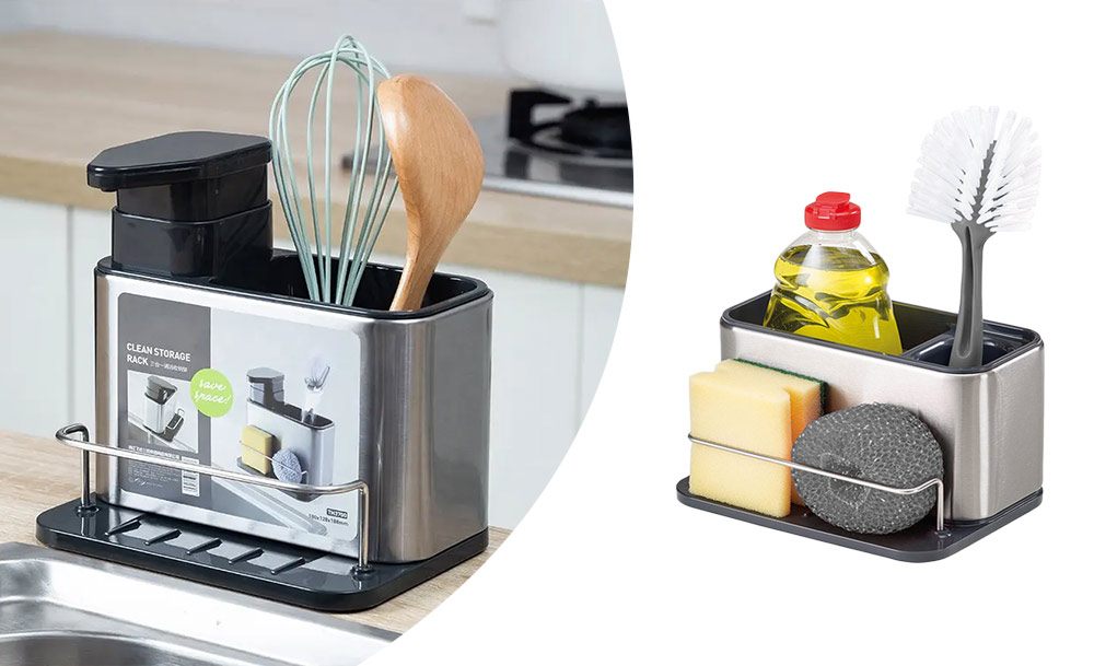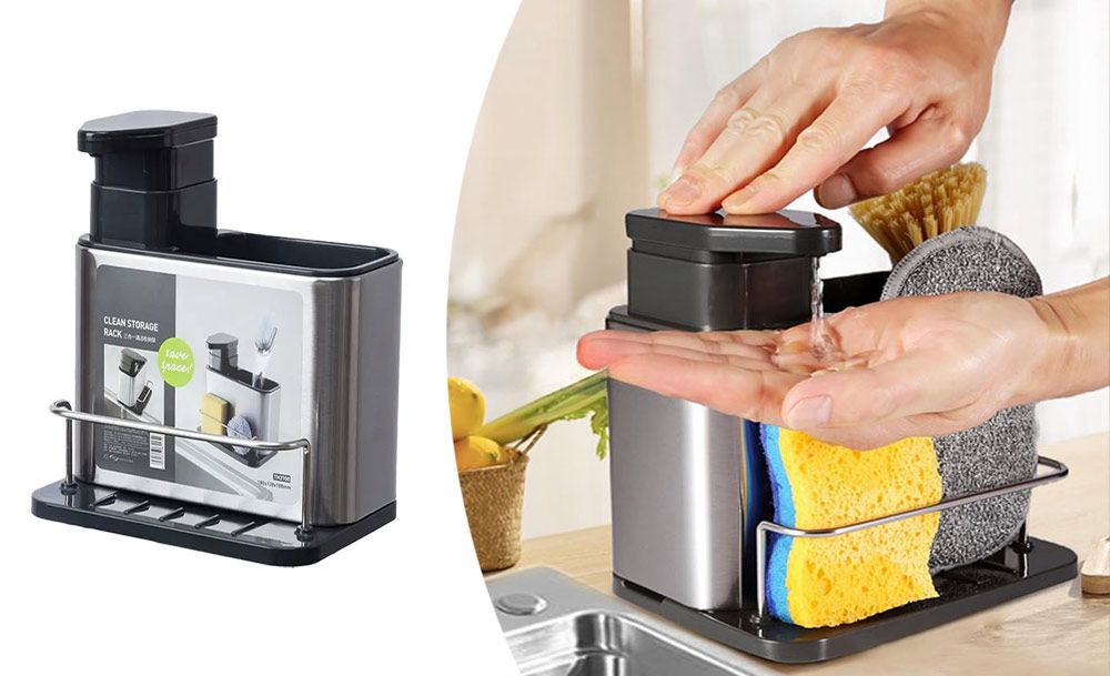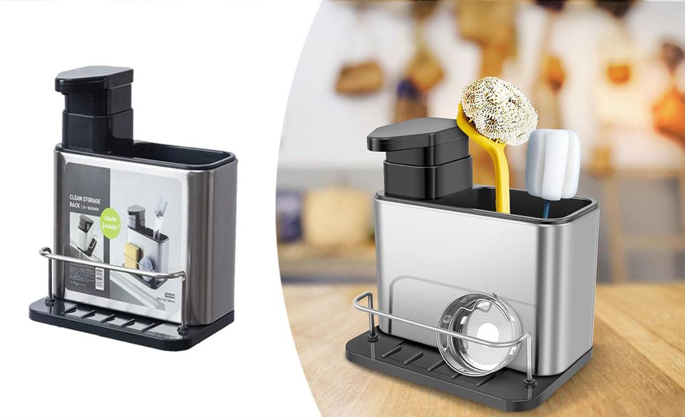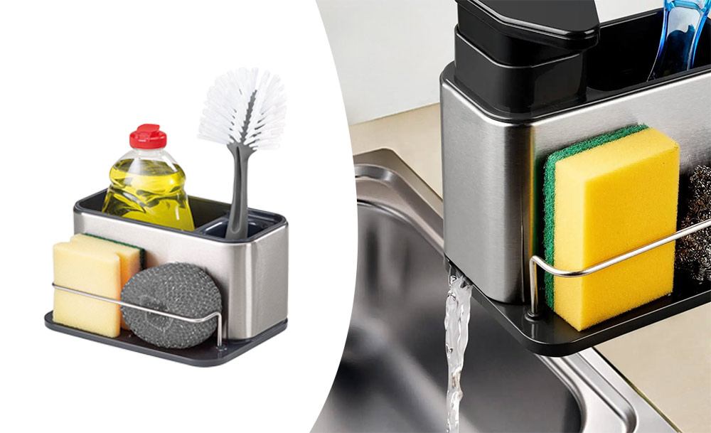 Практичный органайзер HB-19 со встроенным диспенсером для моющего средства обеспечивает удобство и функциональность. Специальный держатель для губок с дозатором жидкого мыла и моющего средства делает процесс мытья посуды еще более эффективным.