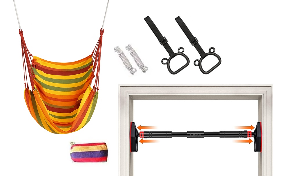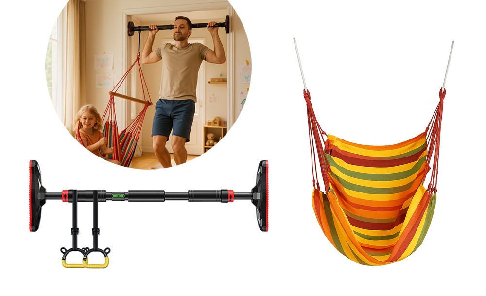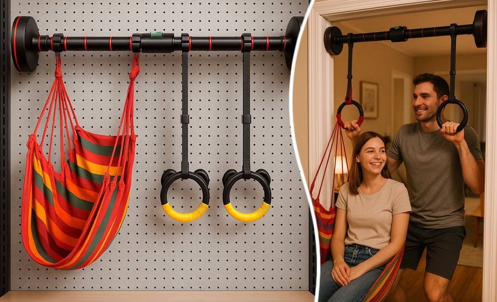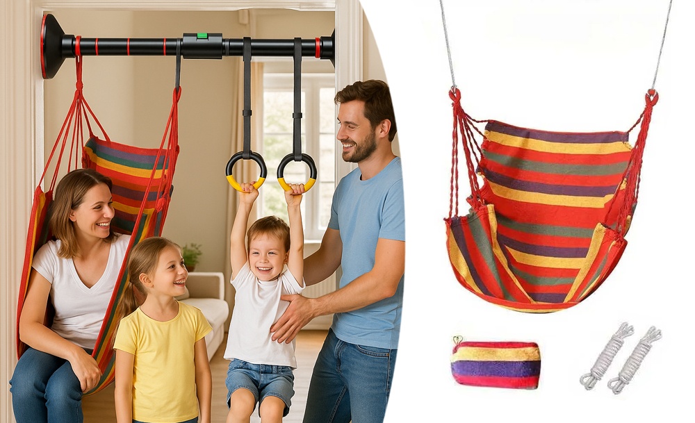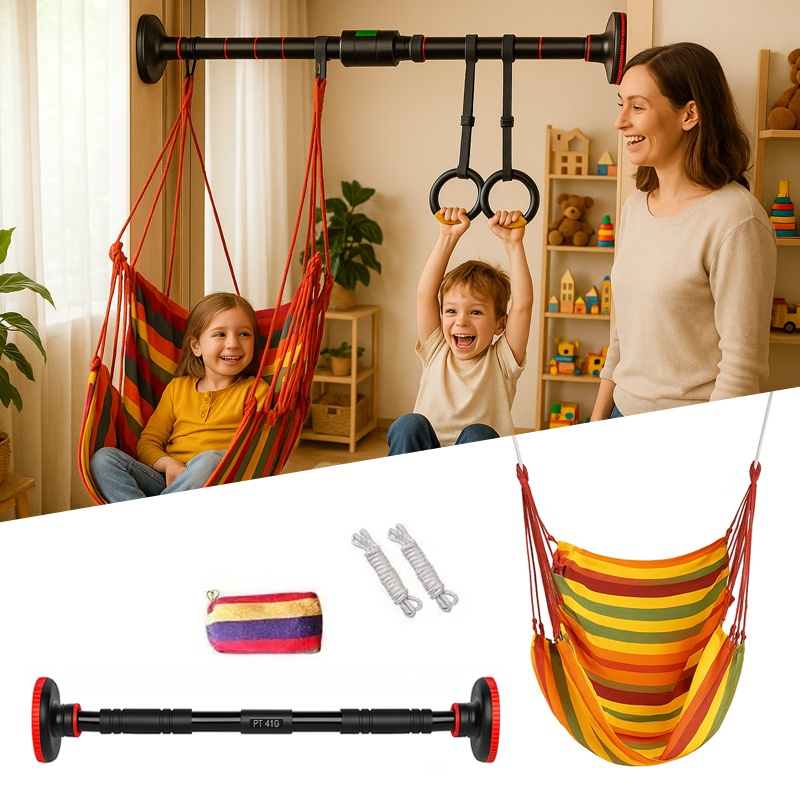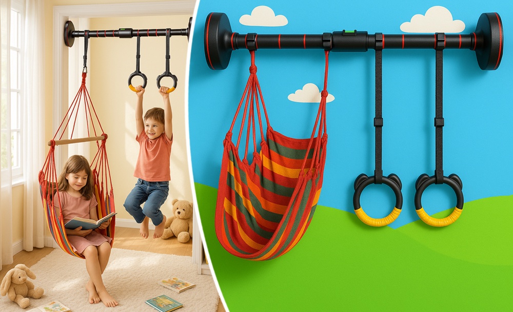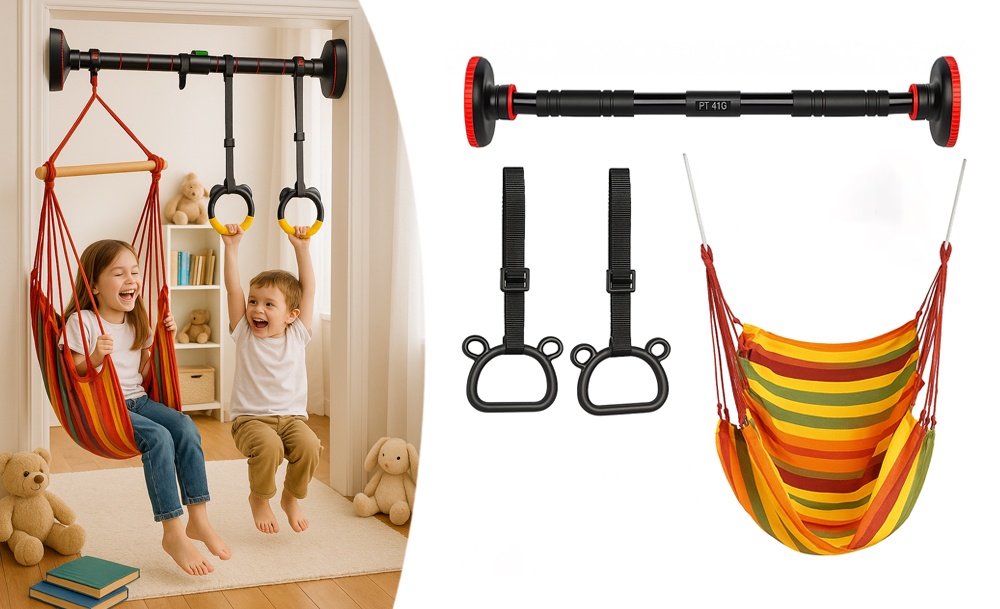 В комплект входят съёмные гимнастические кольца и детская качеля, которые легко регулируются по высоте. Турник становится не только спортивным снарядом, но и игровой зоной для ребёнка — удобное решение для активного дома.