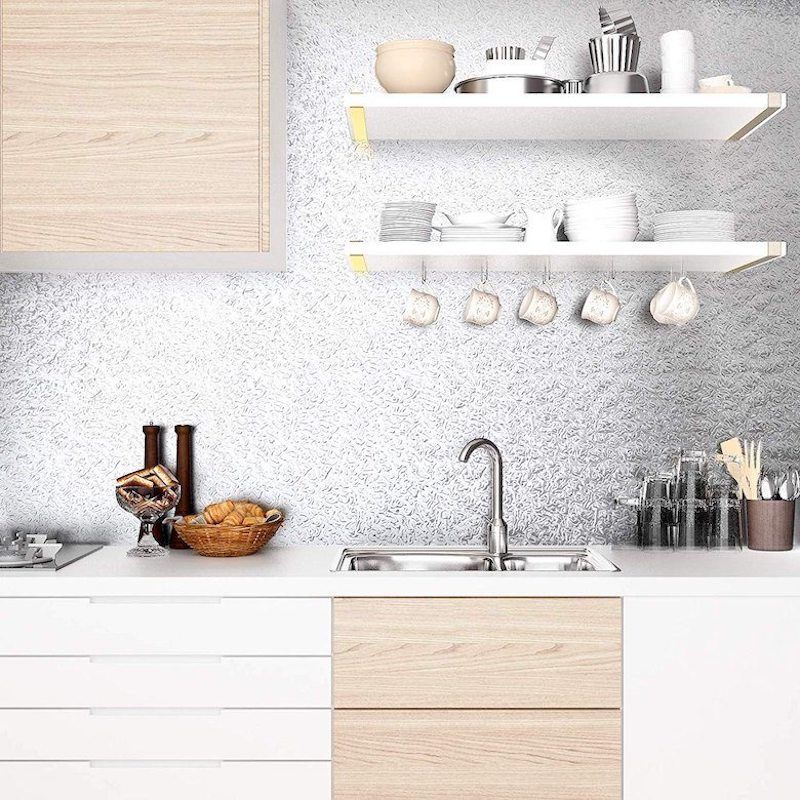 Самоклеящаяся алюминиевая пленка 60×500 см подходит для использования на любых гладких поверхностях в доме, и особенно на кухне. Устойчивая к влаге и плесени, она надежно защитит стены, двери, шкафы, полки и другую мебель от грязи и механических повреждений.