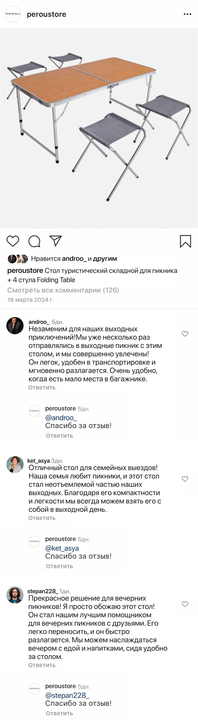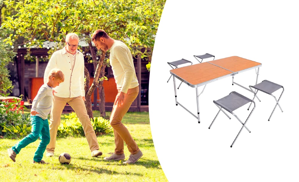 Складной стол – это одна из тех вещей, которая необходима для поездок на пикник. У стола – утолщённый алюминиевый каркас. Четыре стульчика с двойными тканевыми сиденьями. Он очень легко разбирается и моется.