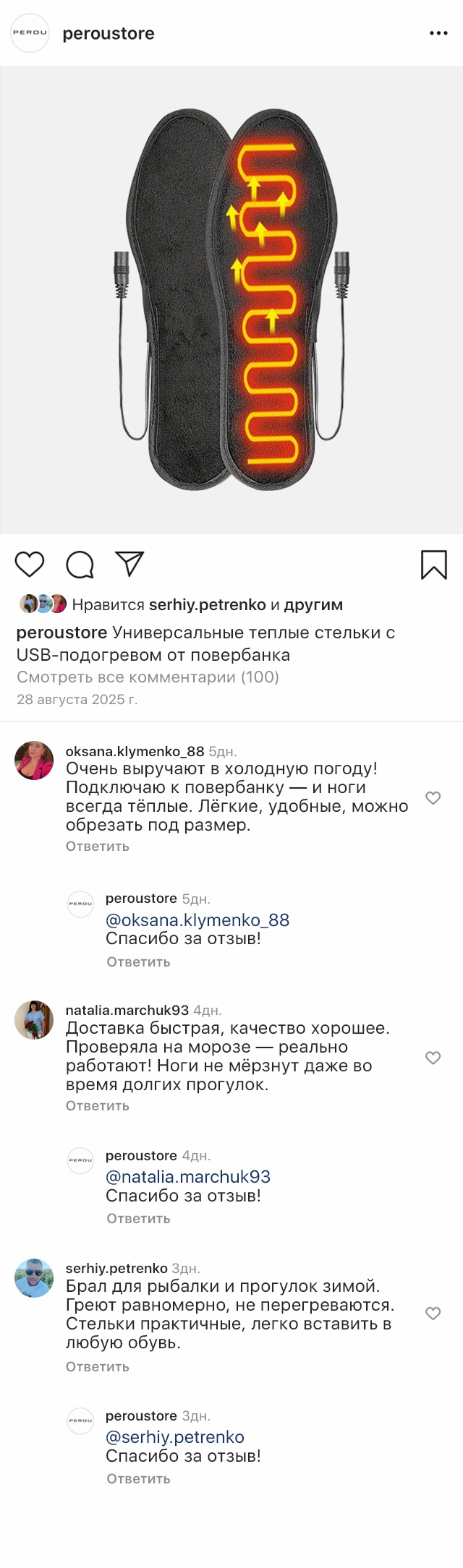 Питаются от любого источника с USB-портом: пауэрбанка, ноутбука или сетевого адаптера, поэтому их удобно использовать дома, в городе или в поездках. Изготовленные из мягкого и гибкого материала, стельки легко подрезаются под нужный размер обуви и совместимы с большинством моделей. Они экономно расходуют энергию, позволяя надолго оставаться в тепле.