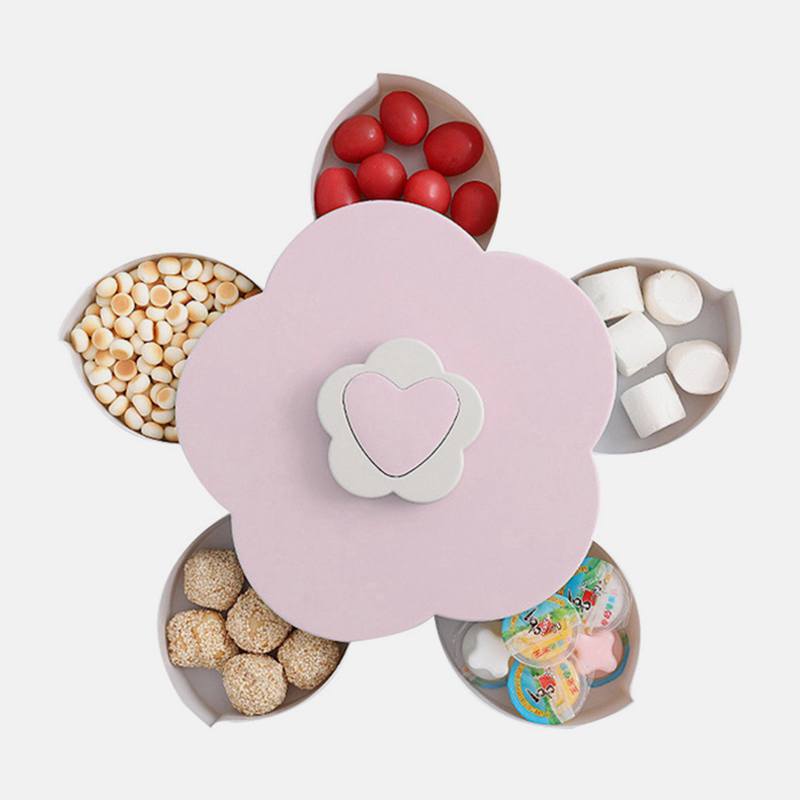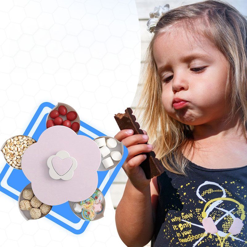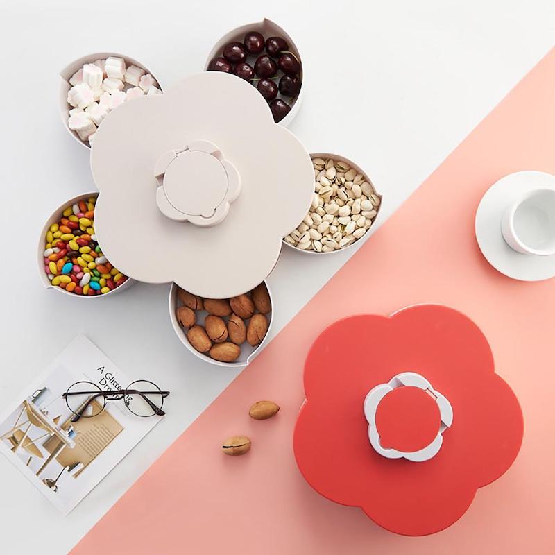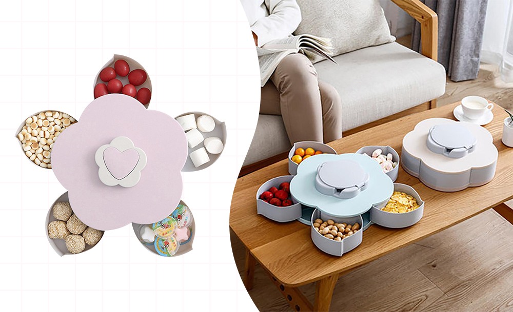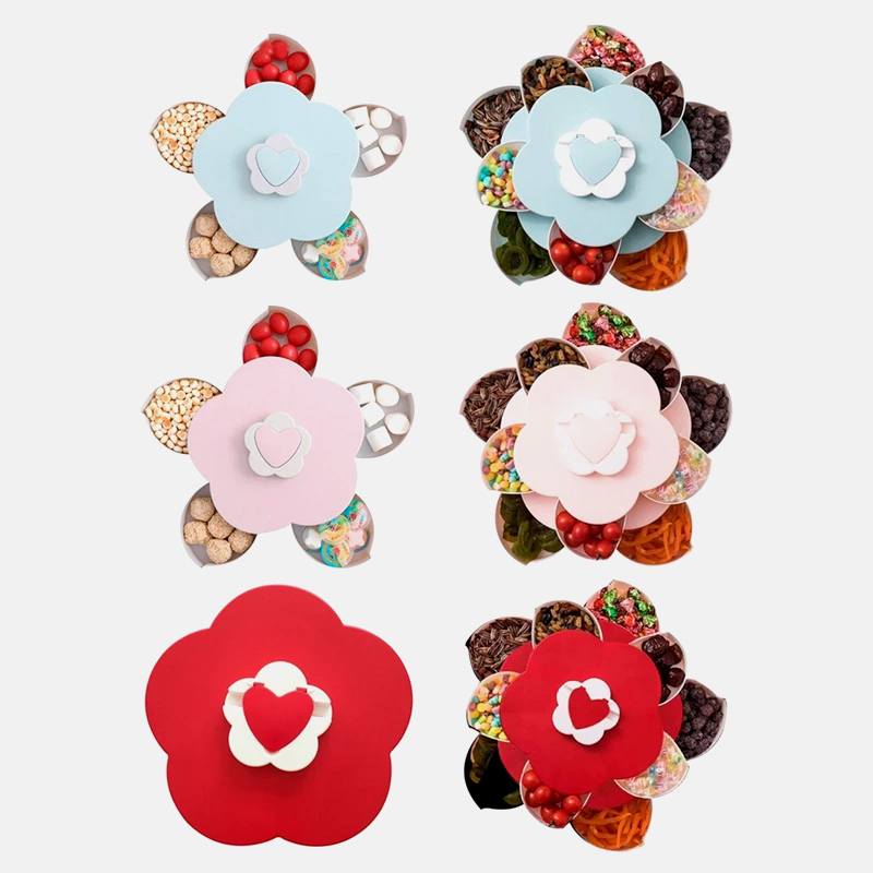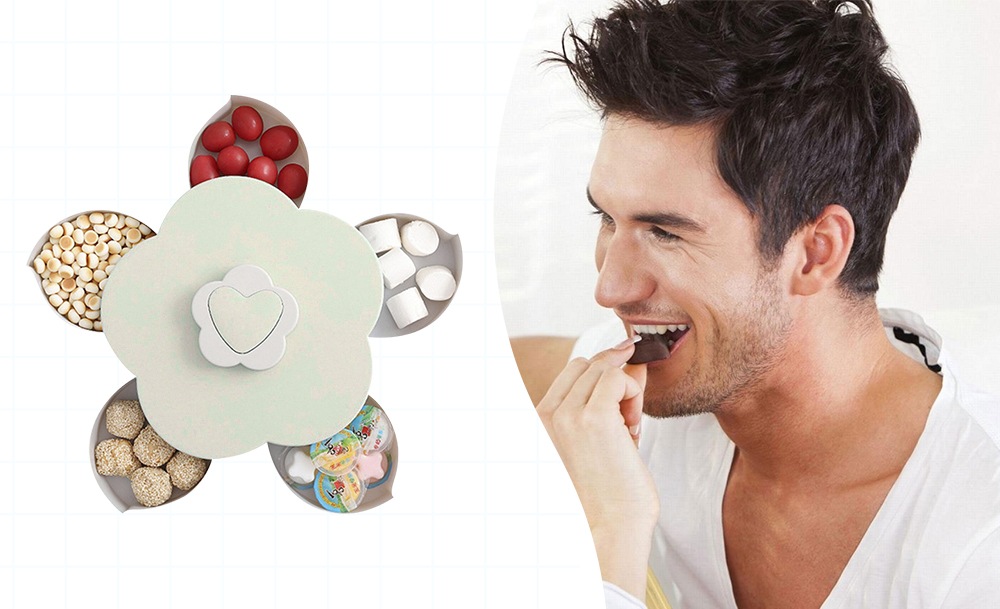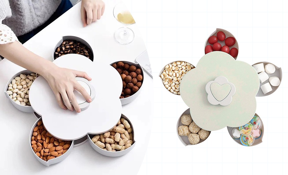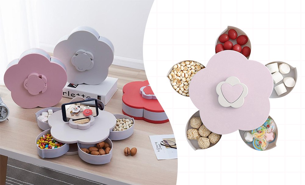 Вращающаяся конфетница с подставкой для телефона – практичный элемент декора вашего стола, который удивит близких и друзей. Органайзер выполнен в форме цветка с лепестками, которые раскрываются и закрываются легким прокручиванием ручки. Внутри лепестков можно разместить конфеты, орехи, фрукты и любые другие закуски.