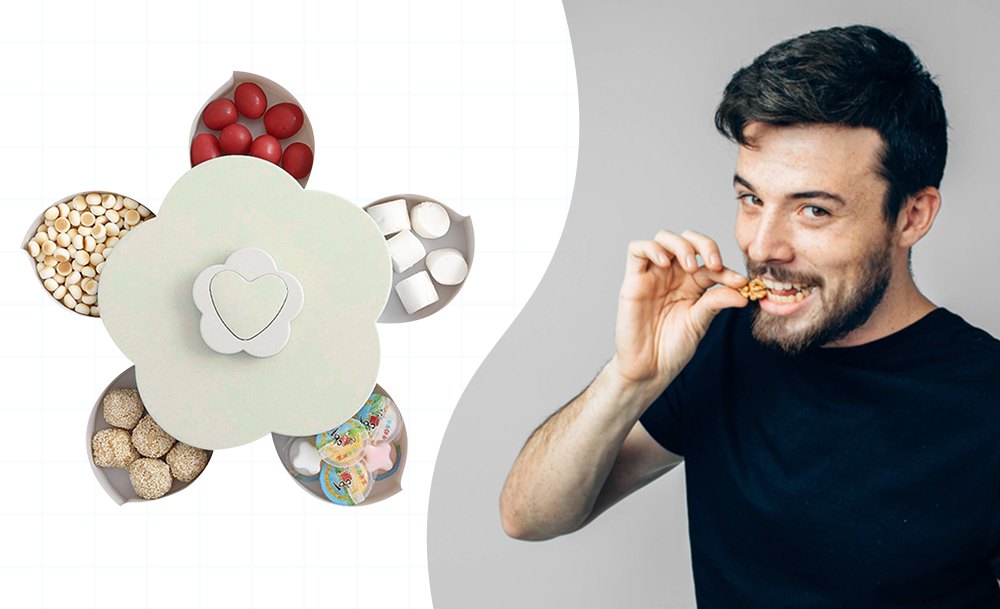 Подставка для телефона размещена в верхней части складной конфетницы, поэтому вы без проблем сможете смотреть видео или фильмы, лакомясь закусками.