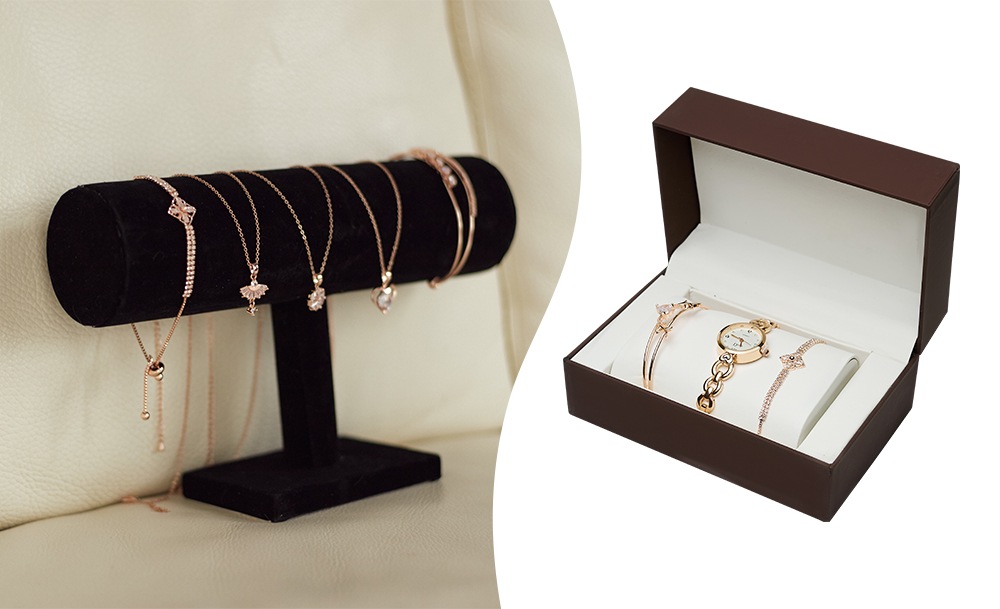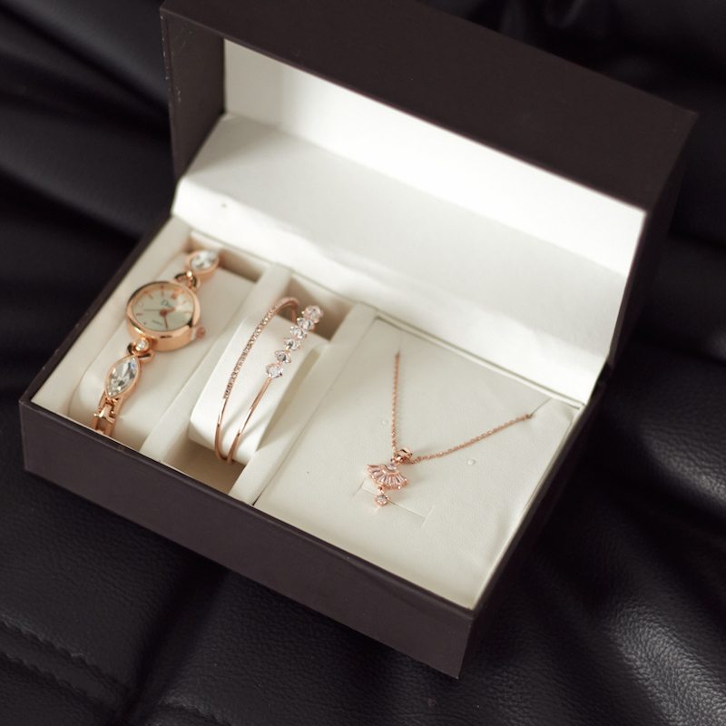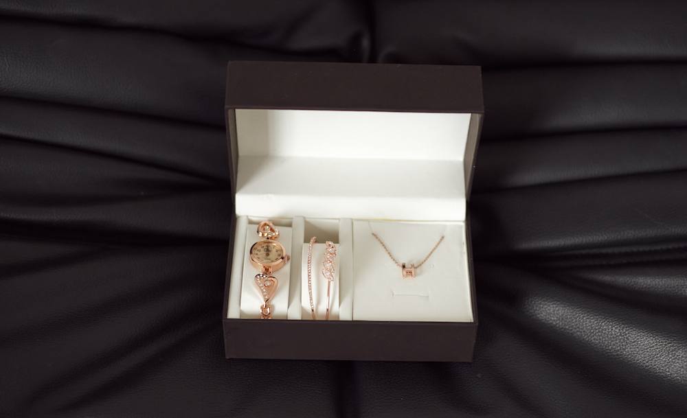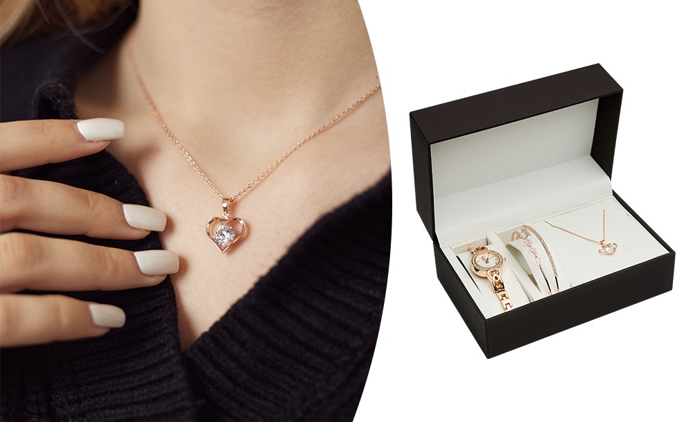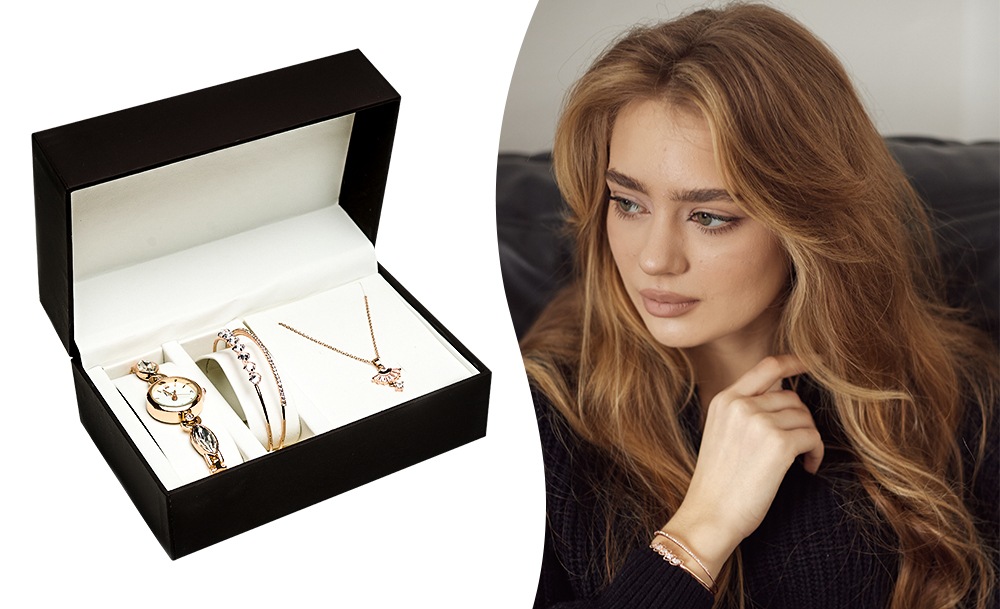 Женский подарочный набор представлен в разных вариантах – часы, двойной тонкий браслет и дополнительный браслет или подвеска на цепочке. Небольшие часики с белым циферблатом на оригинальном браслете создадут утонченный образ.