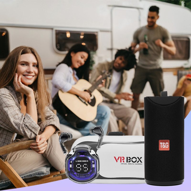 Портативна колонка дарує гучний звук у будь-якому місці — ідеальна для прогулянок, відпочинку або вечірок. Разом усі три пристрої створюють повний мультимедійний набір для сучасної розваги.