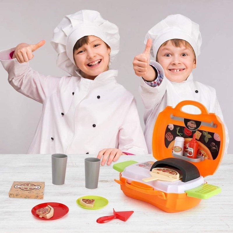 Ігровий набір Pizza включає 22 предмети і призначений для дітей, які бажають поринути в світ приготування смачних піц і кулінарних фантазій. Переносна піцерія збирається в одну дуже зручну валізку на клямках. У розкритому вигляді гра є невеликою робочою зоною з піччю та зоною. для зберігання продуктів та інструментів. З таким набором дитина відчує себе справжнім піццеолом!
