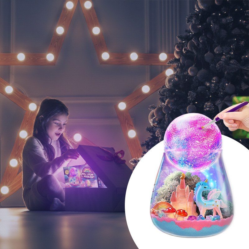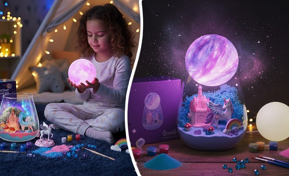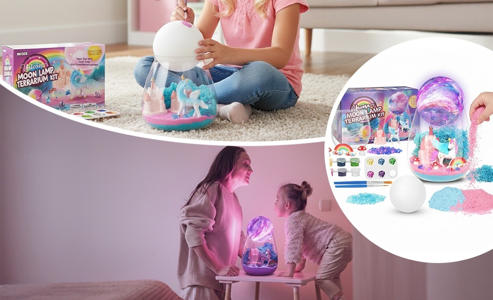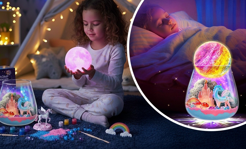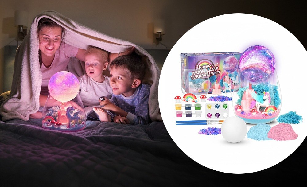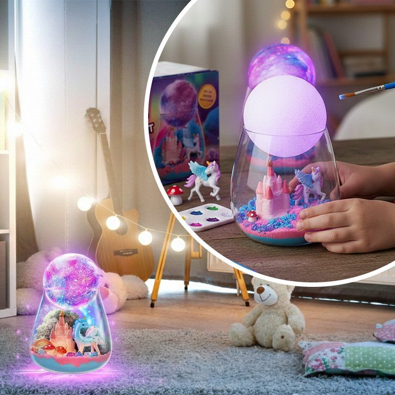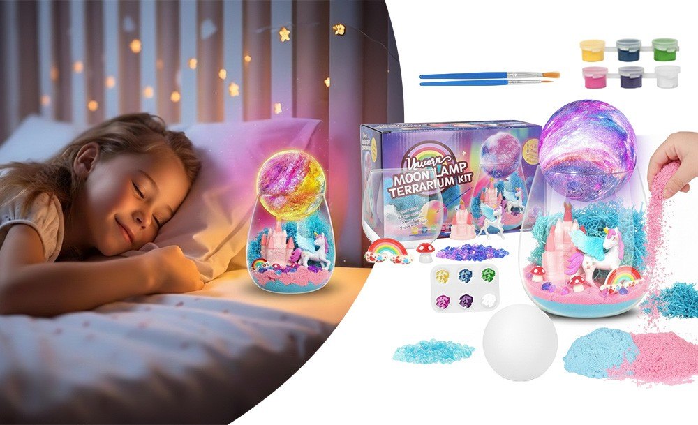 Інтерактивний набір Unicorn Terrarium Kit – це два задоволення в одному: розвивальна іграшка та чарівний нічник. Дитина самостійно створює магічний світ з єдинорогом: прикрашає банку кольоровим кінетичним піском, мохом, камінцями та мініатюрами замку, веселки й грибів, а потім розфарбовує місячну лампу з м’яким підсвічуванням.
