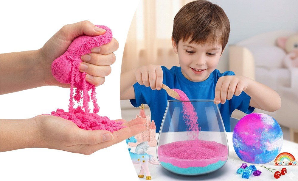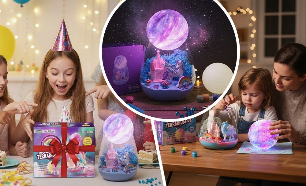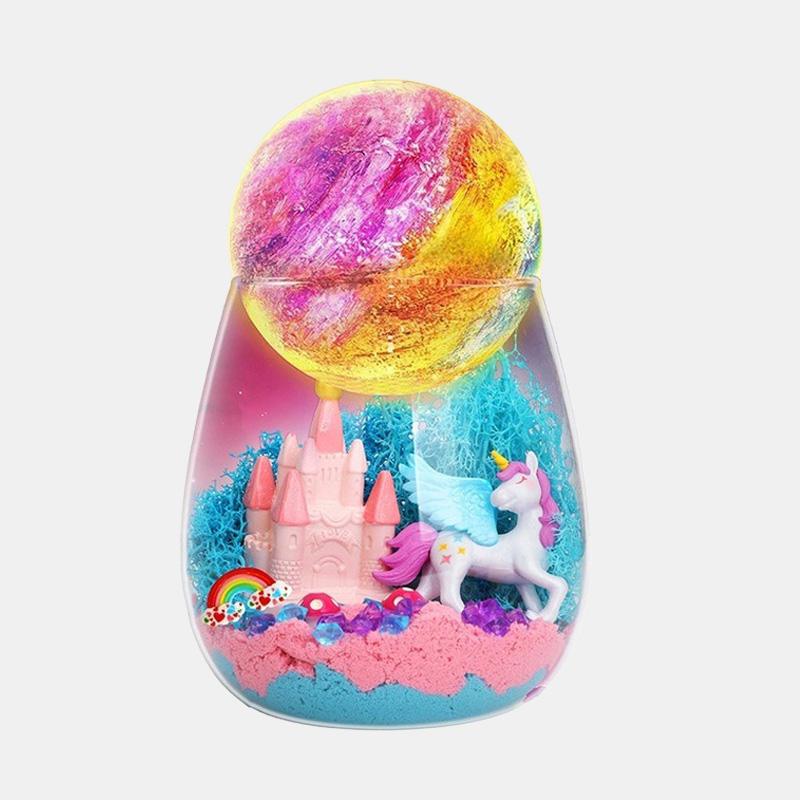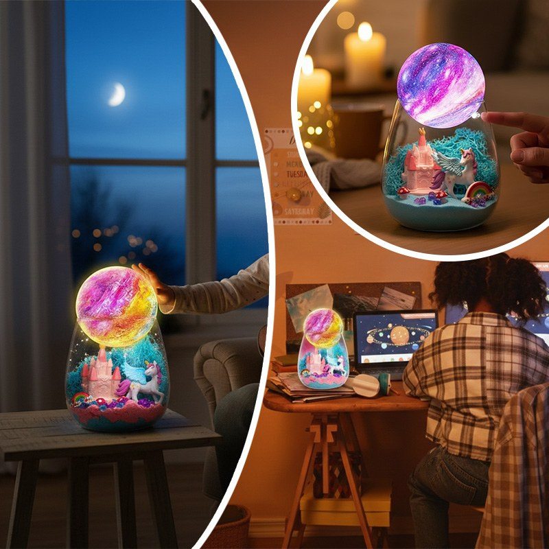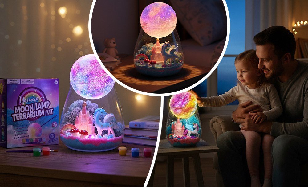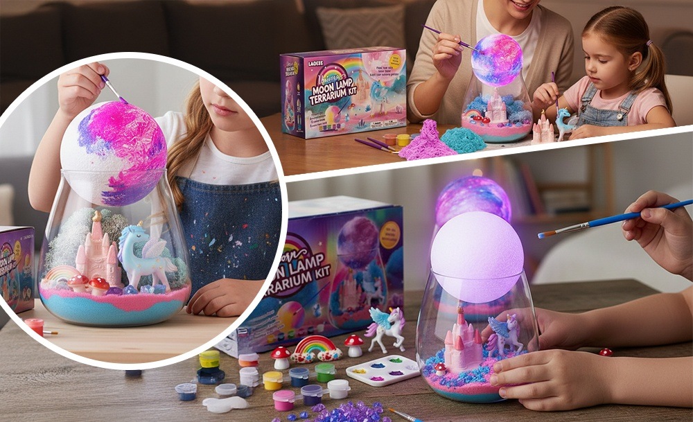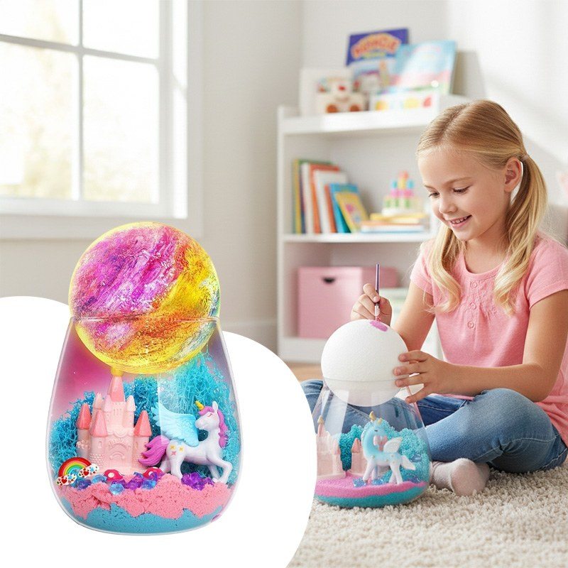 Інтерактивний набір Unicorn Terrarium Kit – це два задоволення в одному: розвивальна іграшка та чарівний нічник. Дитина самостійно створює магічний світ з єдинорогом: прикрашає банку кольоровим кінетичним піском, мохом, камінцями та мініатюрами замку, веселки й грибів, а потім розфарбовує місячну лампу з м’яким підсвічуванням.