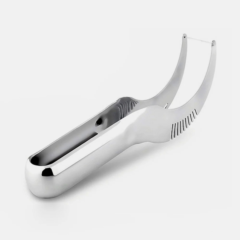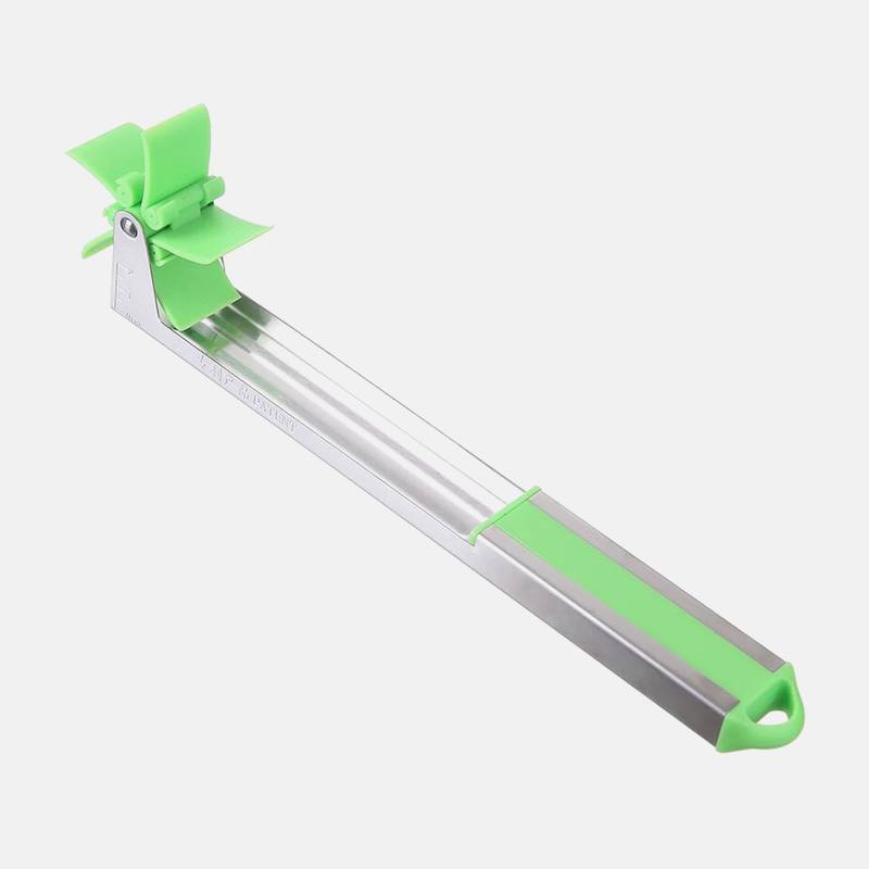Ніж-слайсер з ріжучою частиною у вигляді млина легко нарізає кавун на ідеально рівні шматочки, які поступають у спеціальне поглиблення на рукоятці. Вигнута конструкція ножа для нарізування часточками повторює форму кавуна, завдяки чому можна відокремити м’якоть від шкірки і нарізати на шматочки будь-якого розміру. Він виконан у формі щипців, що забезпечить легке пересування шматочків на тарілку.