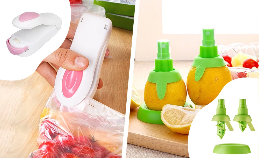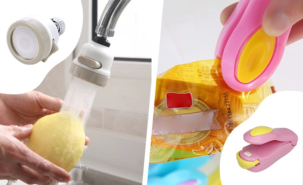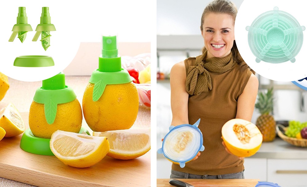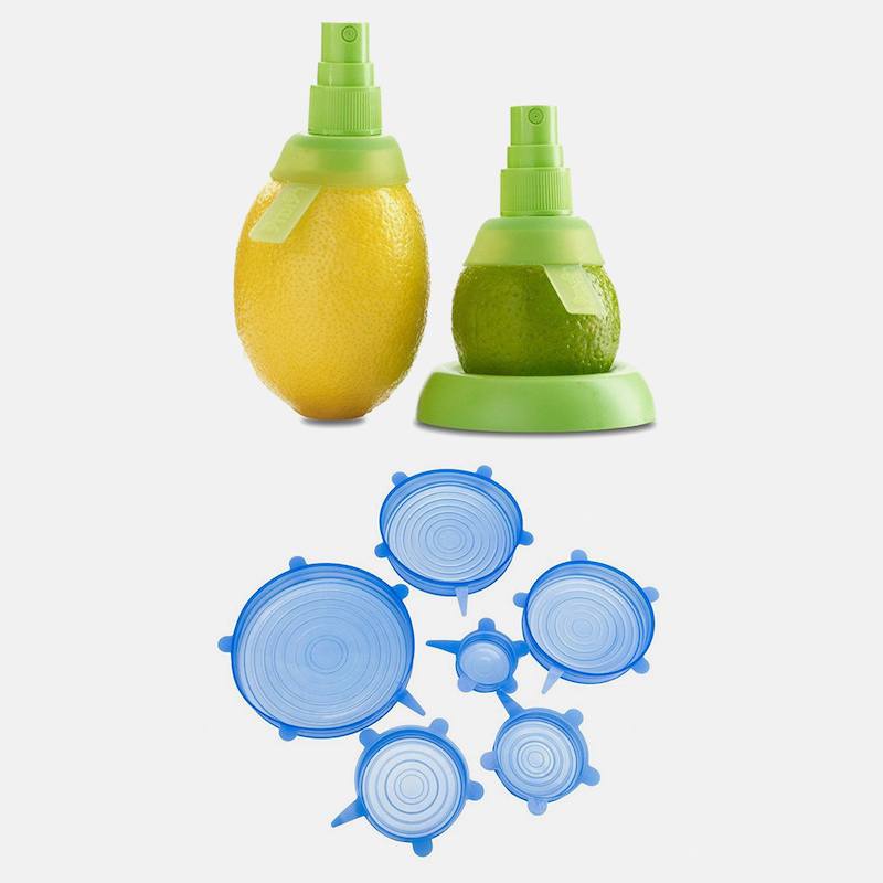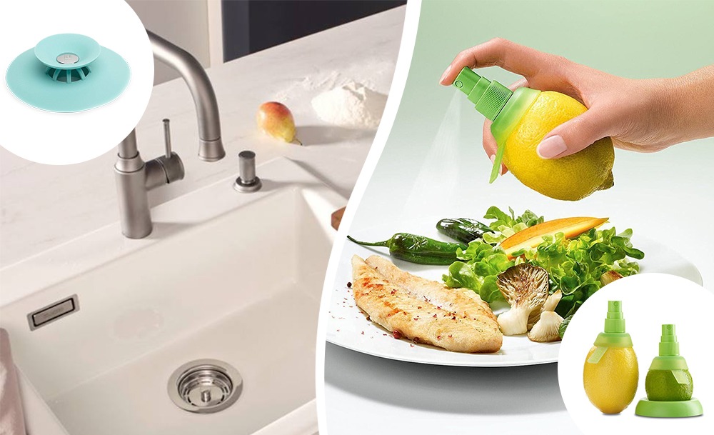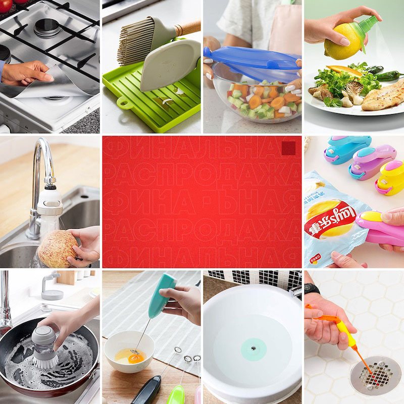 Навести порядок на кухні та організувати простір допоможуть підставка під ложки, силіконові універсальні кришки і ручний запаювальник пакетів. Насадка на кран допоможе заощадити витрати води, а щітка з дозатором для мила зробить миття посуду більш продуктивним. Міксер для вершків і спрей для цитрусових 3 в 1 зроблять ваші страви ідеальними.