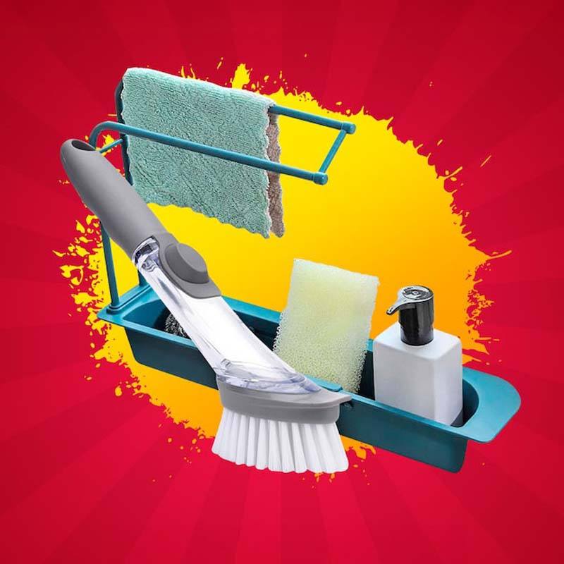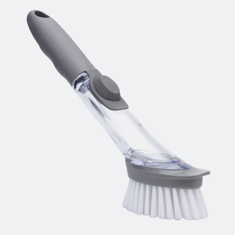 Щітка для миття посуду легко видаляє забруднення та не дряпає поверхню. Вбудований дозатор для миючого засобу регулює витрати рідини одним натисканням кнопки. Універсальний пристрій можна використовувати для миття посуду, плити, раковини та кухонної плитки.