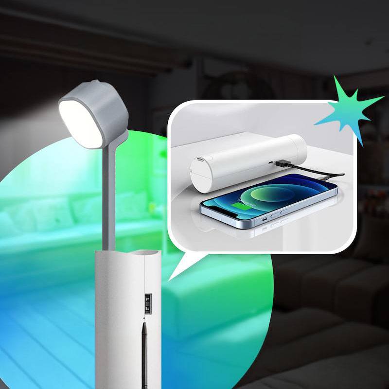 Підставка лампи оснащена упором, на якому можна закріпити телефон або планшет, щоб зручно переглядати екран, звільнивши руки. На корпусі лампи знаходиться роз’єм для її заряджання та USB-порт, через який можна заряджати смартфон й інші гаджети.