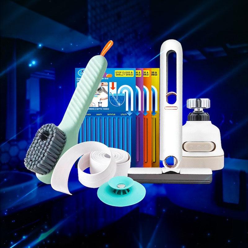 Універсальна силіконова пробка застосовується у ванні та раковинах. Насадка на кран із поворотним шарніром зручна у використанні. Самоклейка стрічка з силікону ізолює стик ванни та плитки від вологи. Палички Sani Sticks справляються з уже наявними засміченнями та запобігають появі нових.