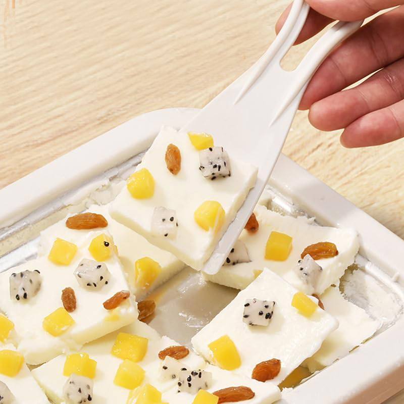 Потім вийміть холодний посуд для морозива із зони заморожування і налийте змішаних інгредієнтів у лоток для швидкого заморожування, зачекайте 5 хвилин, потім зачерпніть і перемішайте, поки не утвориться морозиво. Використовуйте скребок, щоб створити красиве і смачне морозиво. Додайте фрукти, горіхи, посипку або шоколадну стружку.