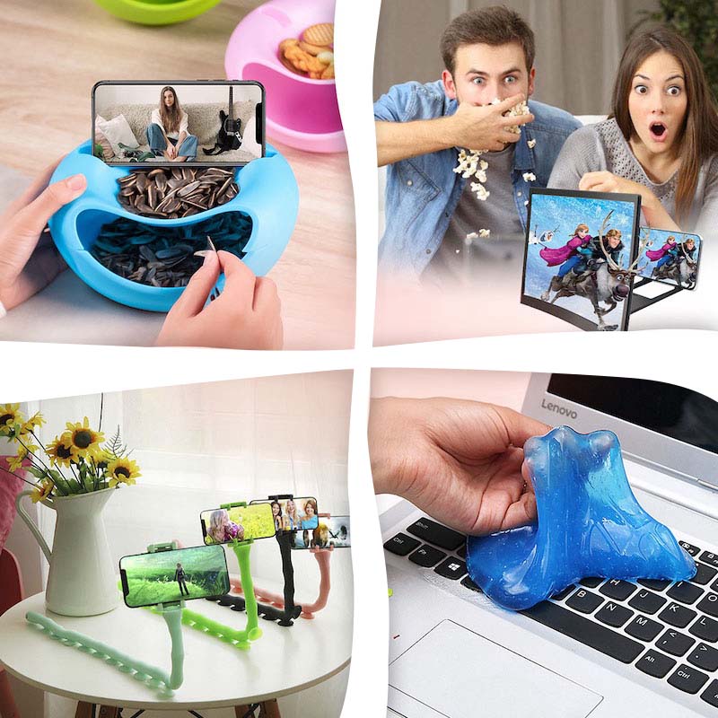 Гнучкий тримач з присосками кріпиться до будь-яких поверхонь будинку або на природі. Його можна використовувати, щоб зробити фото і Селфі, або просто поговорити по телефону, звільнивши руки. Гель лизун призначений для очищення будь-яких ребристих або важкодоступних поверхонь, наприклад, клавіатури комп’ютера або пульта телевізора.