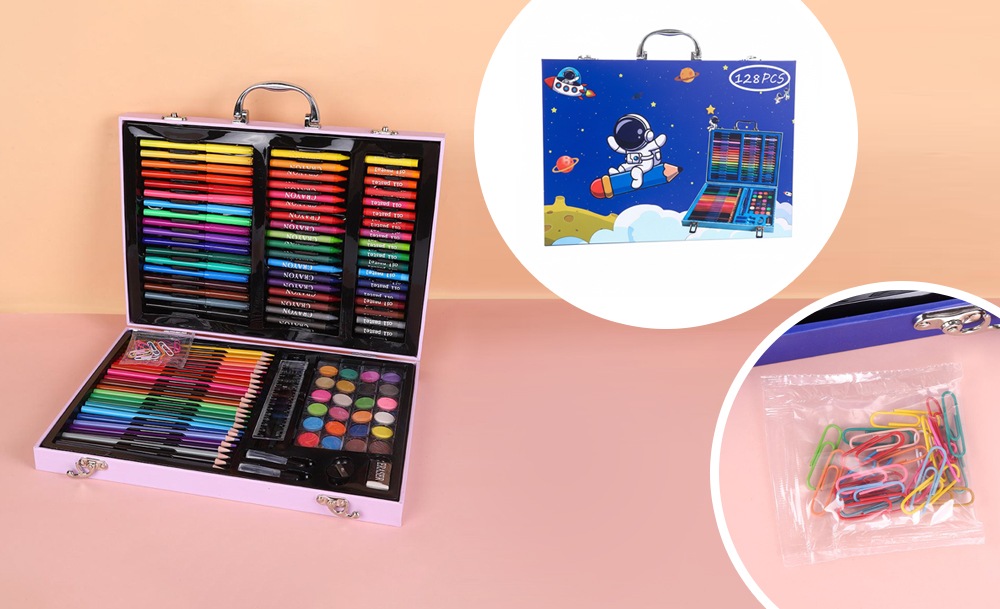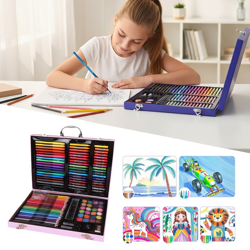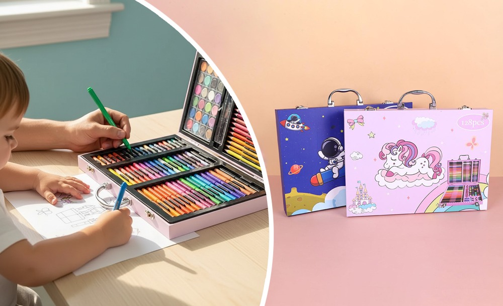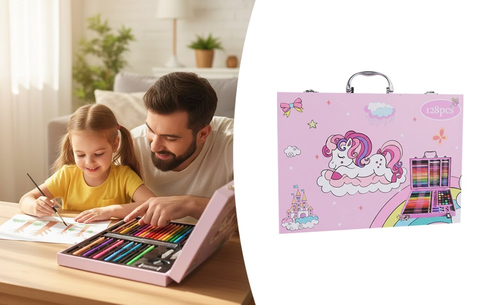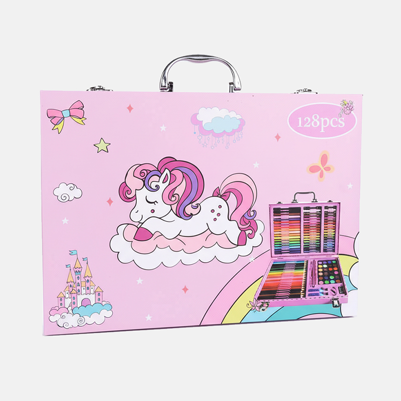Набір для малювання з 128 предметів у казковому кейсі — це повний комплект для творчості, який сподобається дітям будь-якого віку. У зручному кейсі зібрані олівці, фломастери, воскові крейди, пензлики, фарби та інші аксесуари для малювання та творчості.