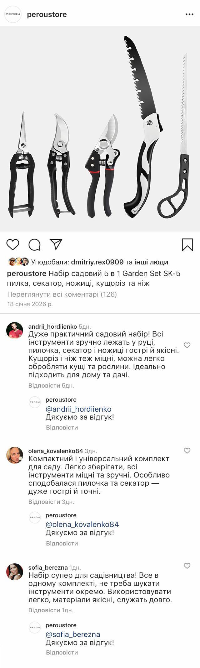 Набір 5 в 1 Garden Set SK-5 – усе, що потрібно для догляду за садом в одному комплекті! Пилка, секатор, ножиці, кущоріз та ніж виготовлені з міцних матеріалів і прослужать багато років. Ергономічні ручки роблять роботу безпечною, а компактні інструменти зручно складаються для зберігання або перенесення в інше місце.