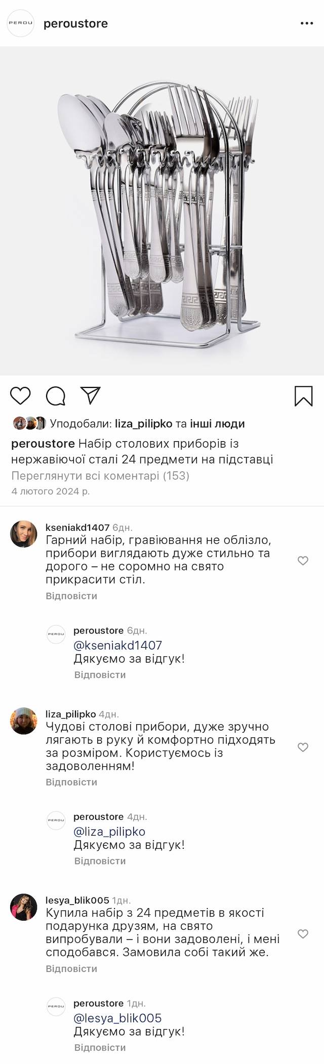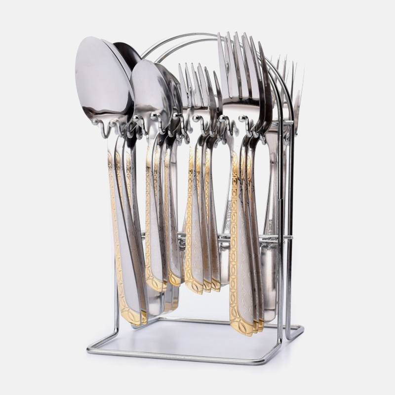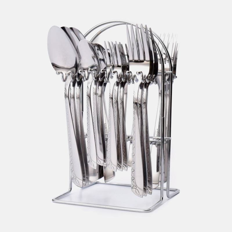 У набір входять 6 виделок, 6 ножів, 6 столових і 6 чайних ложок, які мають різноманітну форму та дизайн завдяки гравіюванню. Прибори чудово збалансовані, легкі та комфортні за розміром, зручно лягають в руку, що дозволить використовувати їх не лише для повсякденного вжитку в родинному колі, але й для зустрічі гостей в урочистих випадках.