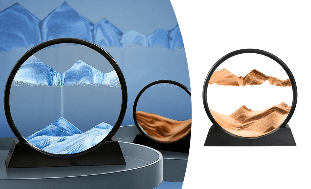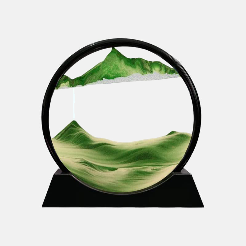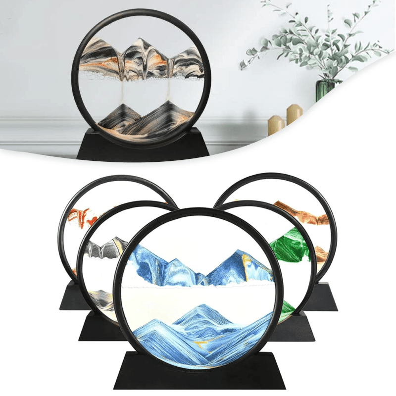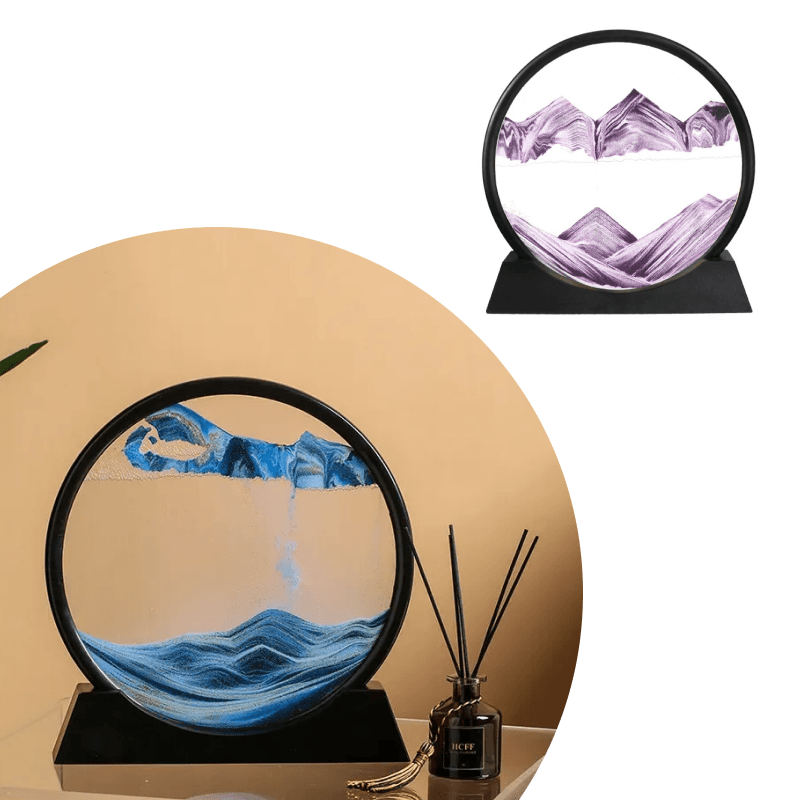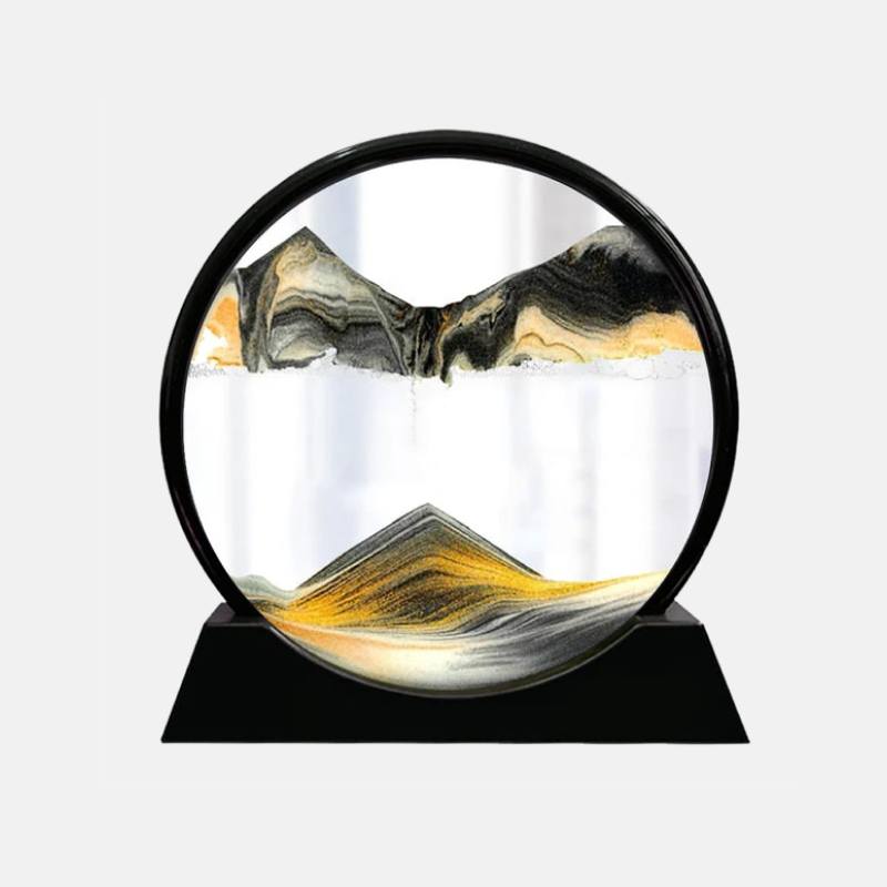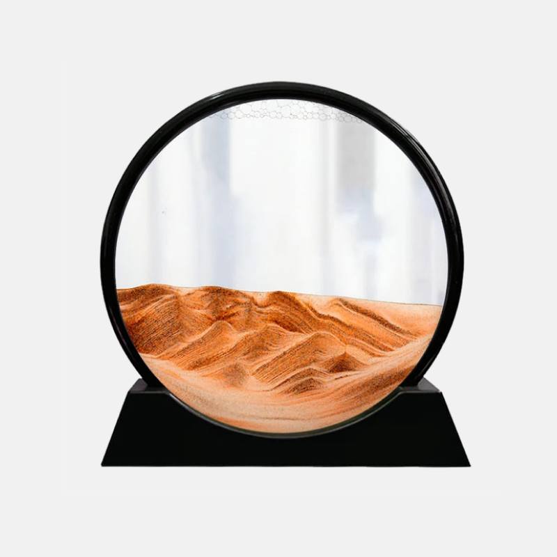 Рух піску трансформується в абстракції, що надихаються гірськими видами, долинами, пустелями та навіть теракотовими ділянками. Коли пісок повністю стікає, легко повернути картину будь-яке інше положення, оскільки вона кругла і легко відокремлюється від основи.