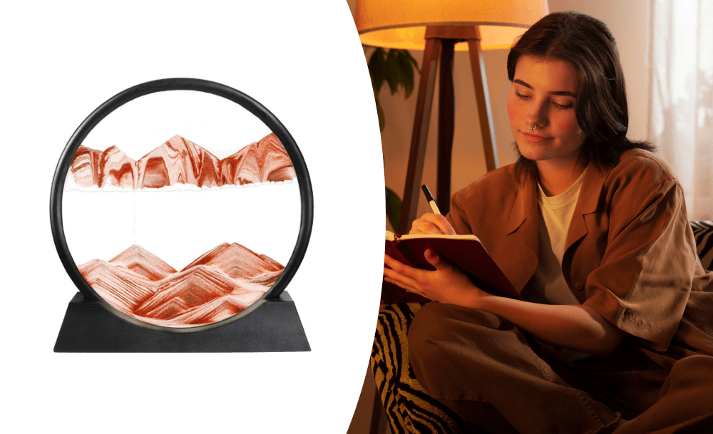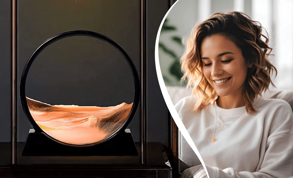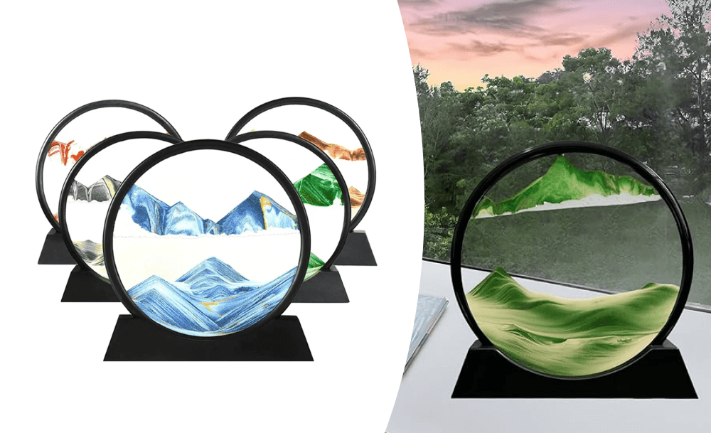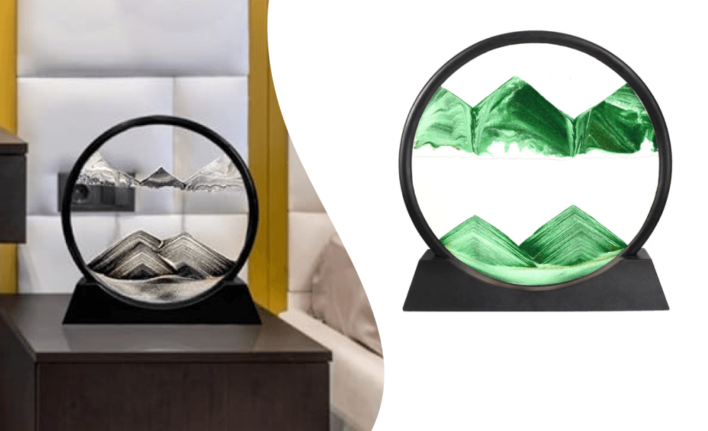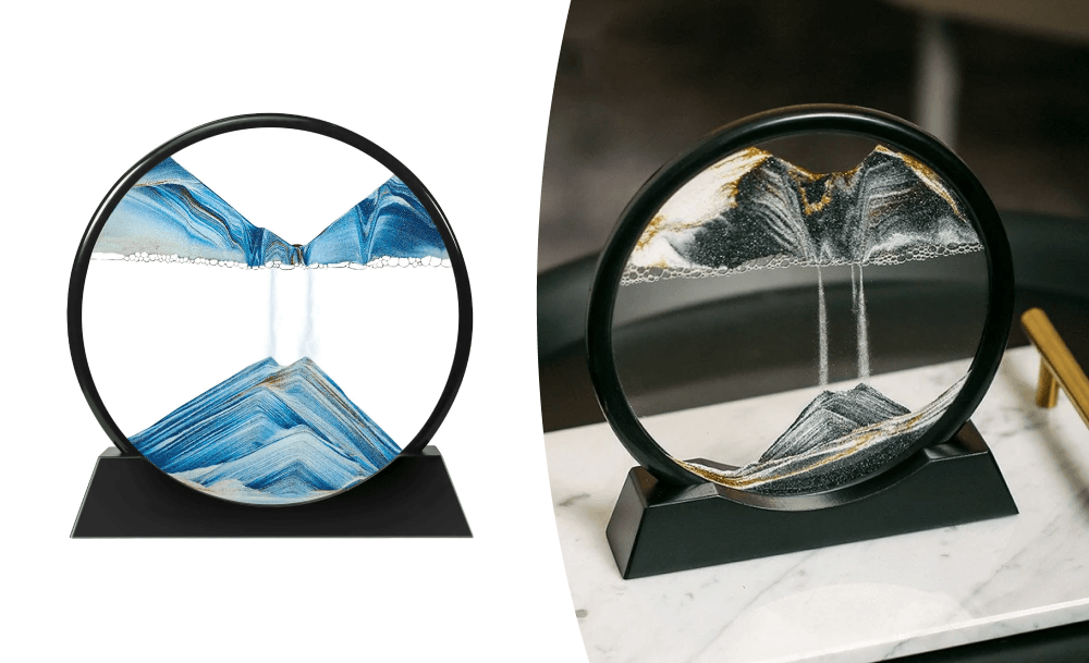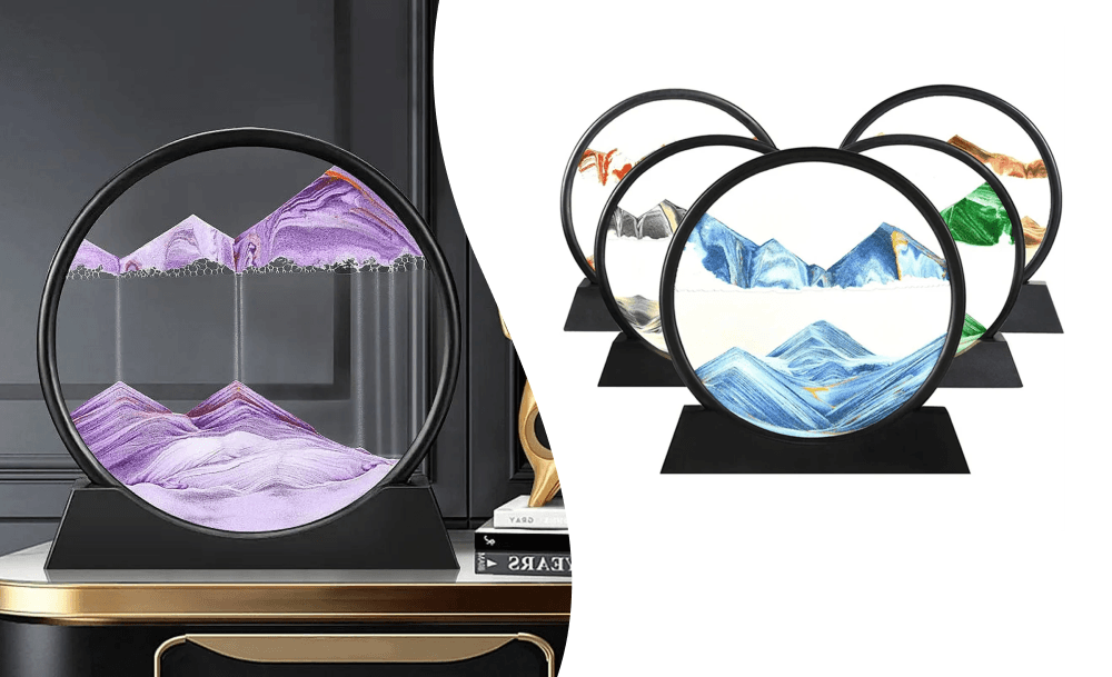 Рух піску трансформується в абстракції, що надихаються гірськими видами, долинами, пустелями та навіть теракотовими ділянками. Коли пісок повністю стікає, легко повернути картину будь-яке інше положення, оскільки вона кругла і легко відокремлюється від основи.